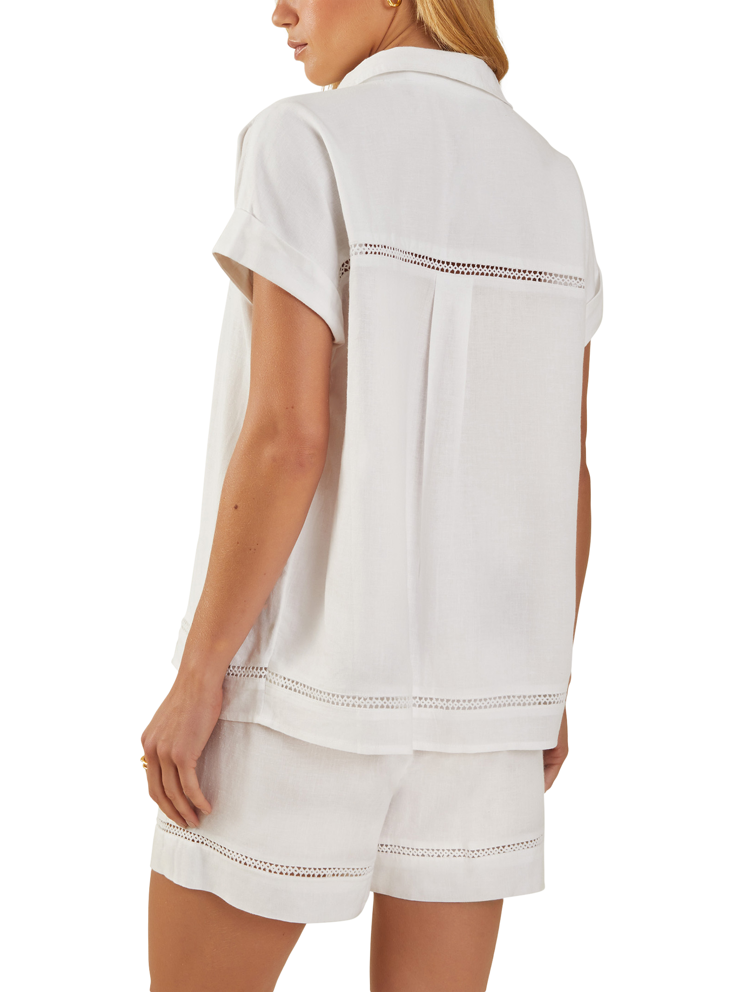 A smart choice to pack as a beach cover-up for your next sunshine escape. Designed in a lightweight linen and viscose blend, this shirt features capped sleeves, front button fastenings, and decorative embroidery at the hem.