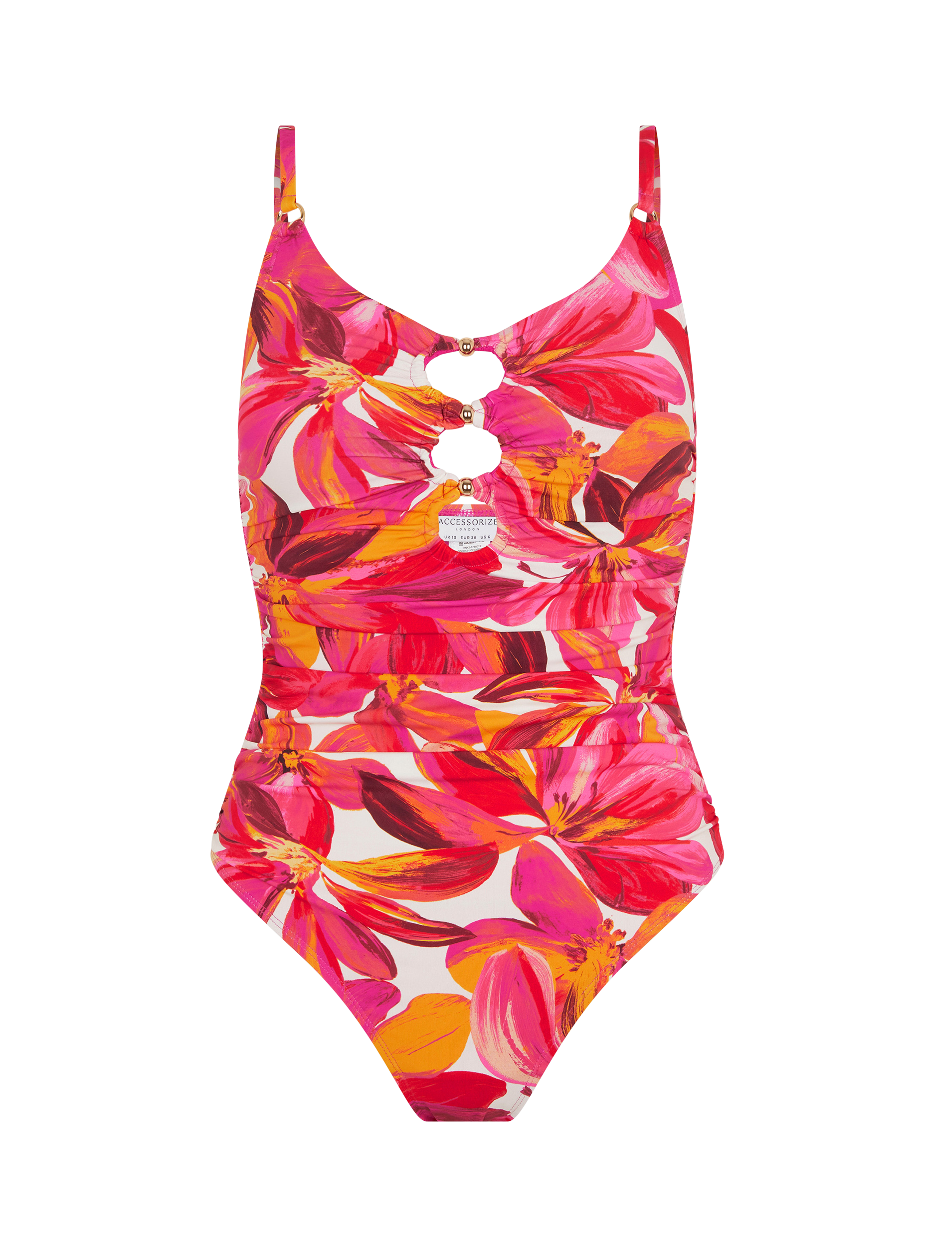 Bursting with a vibrant floral print, this super stretchy swimsuit is complete with a trio of cut-outs at the chest.