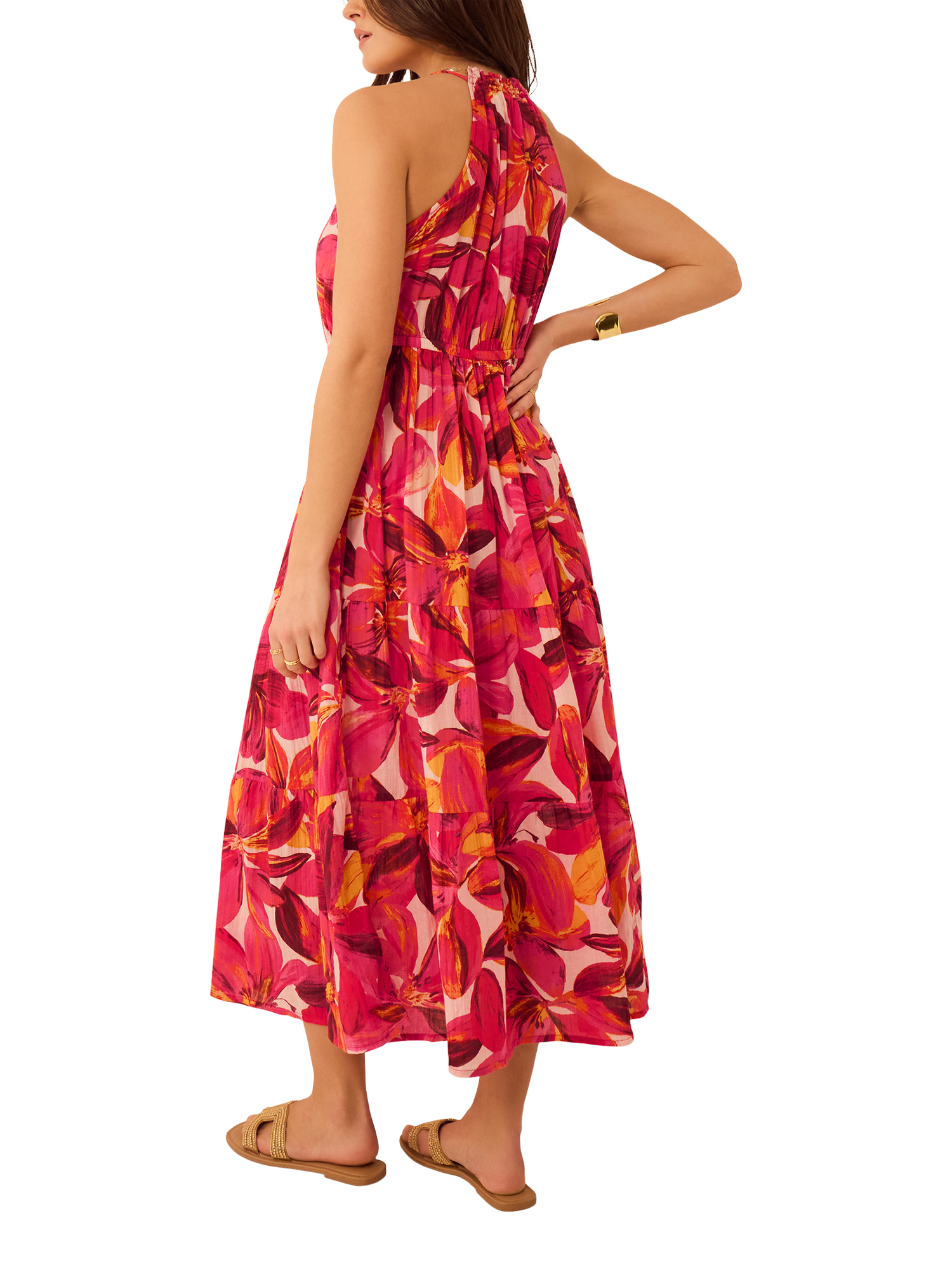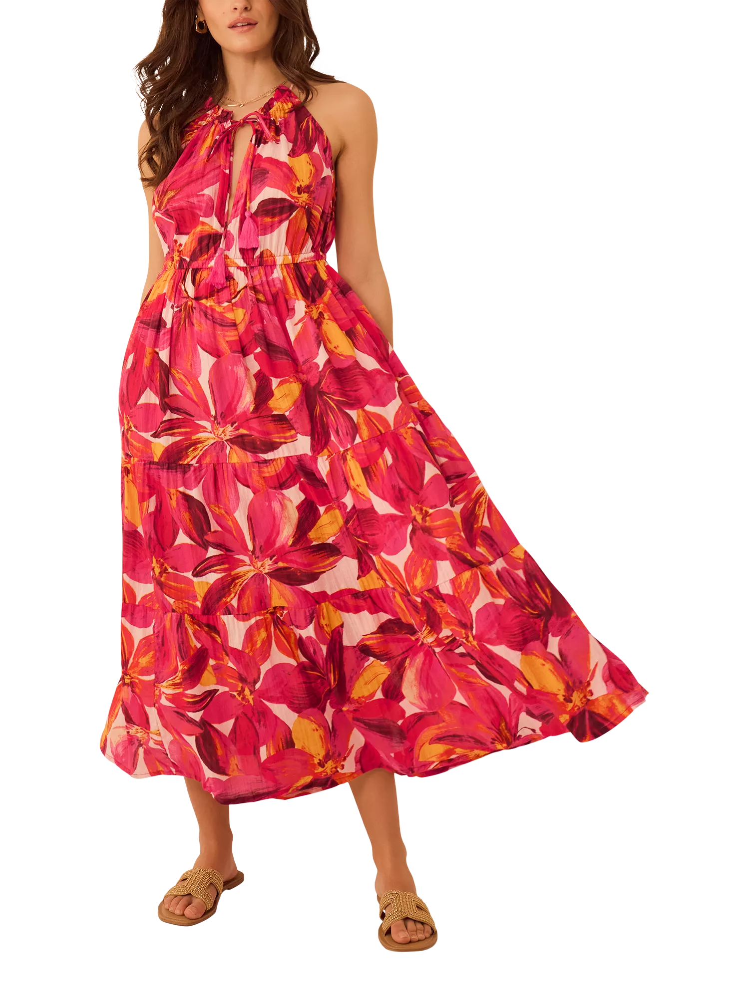 Bursting with a vibrant floral print, this midi dress is designed with a ruffled halter neck and tassel tie.