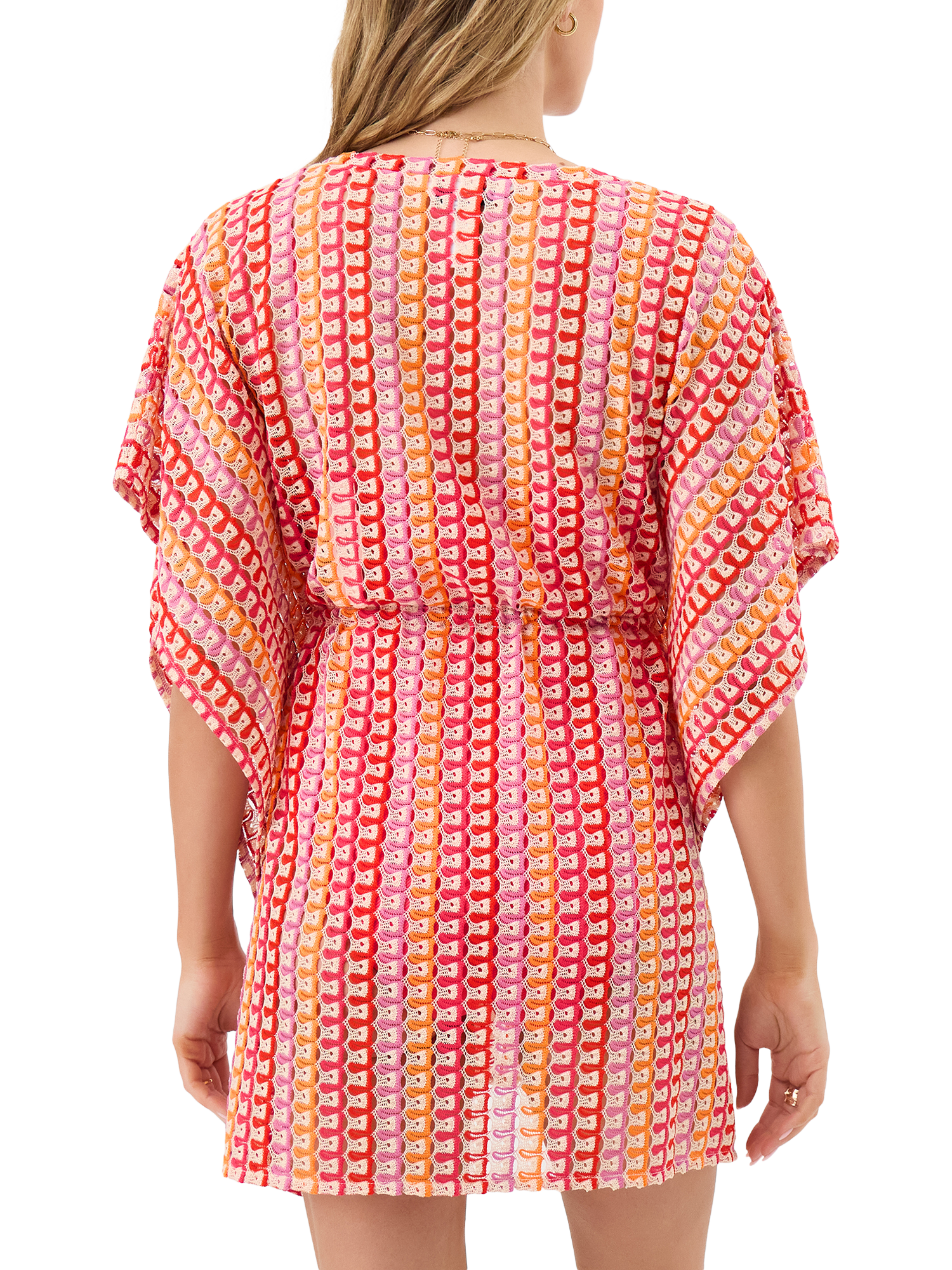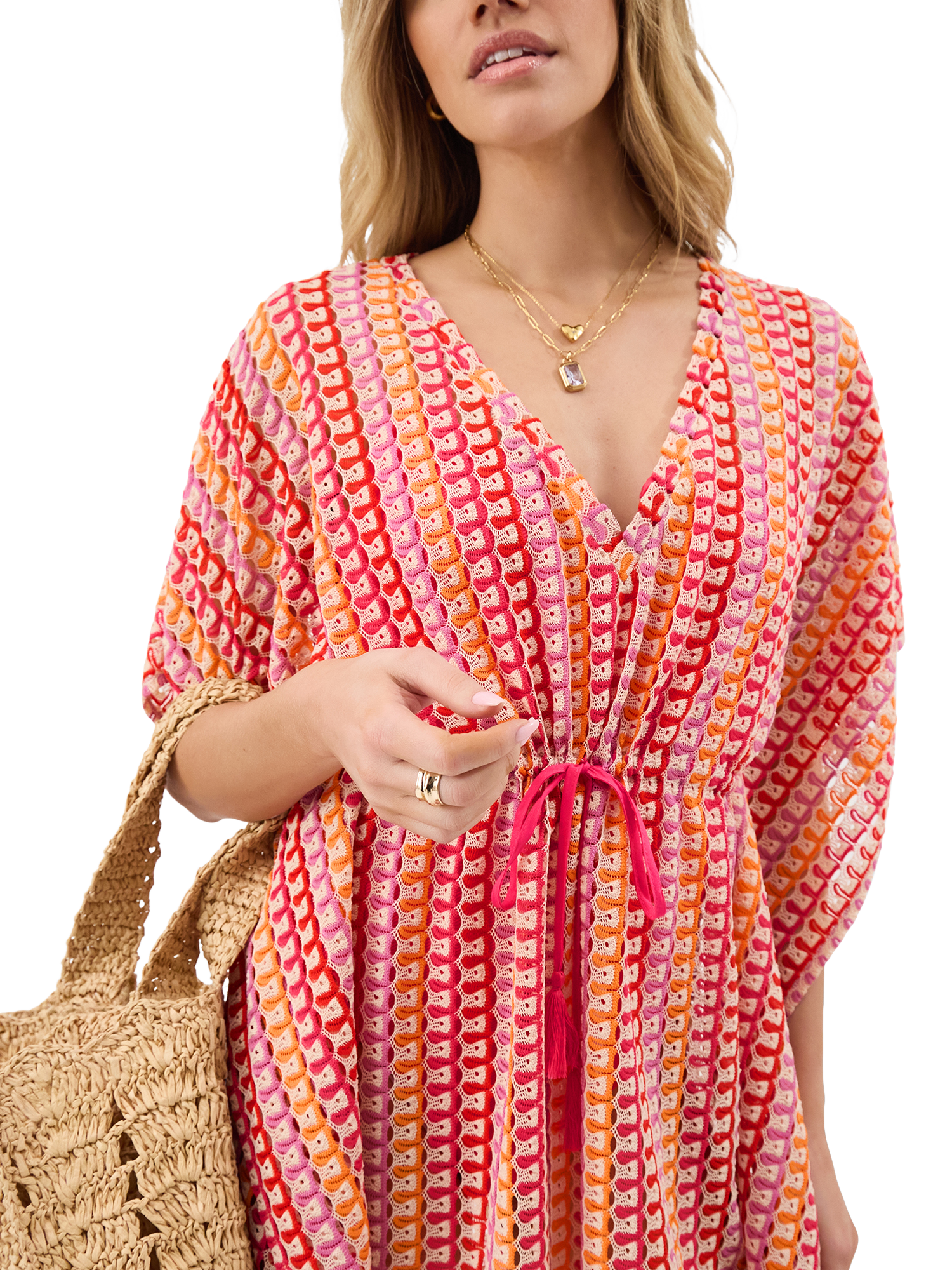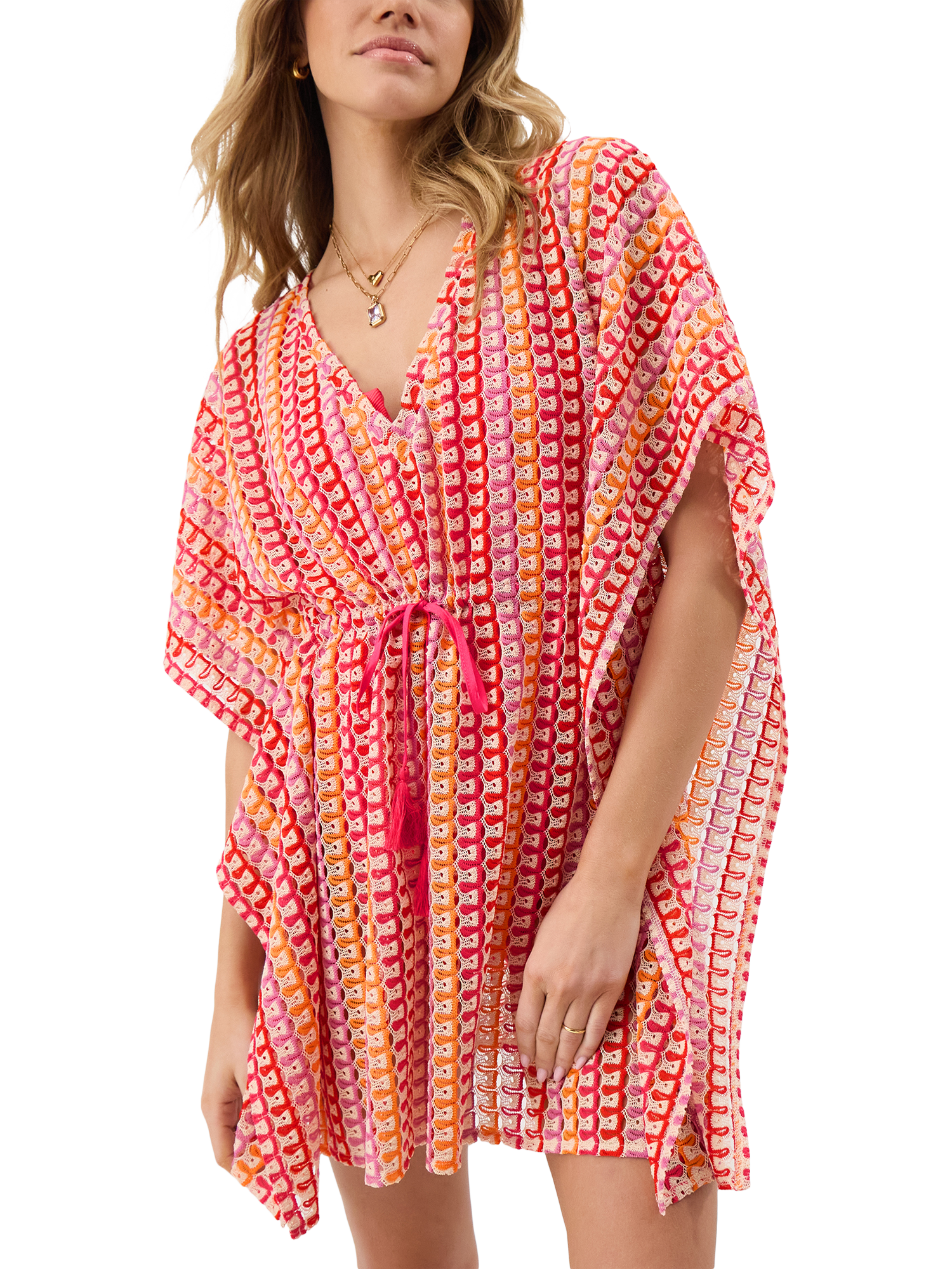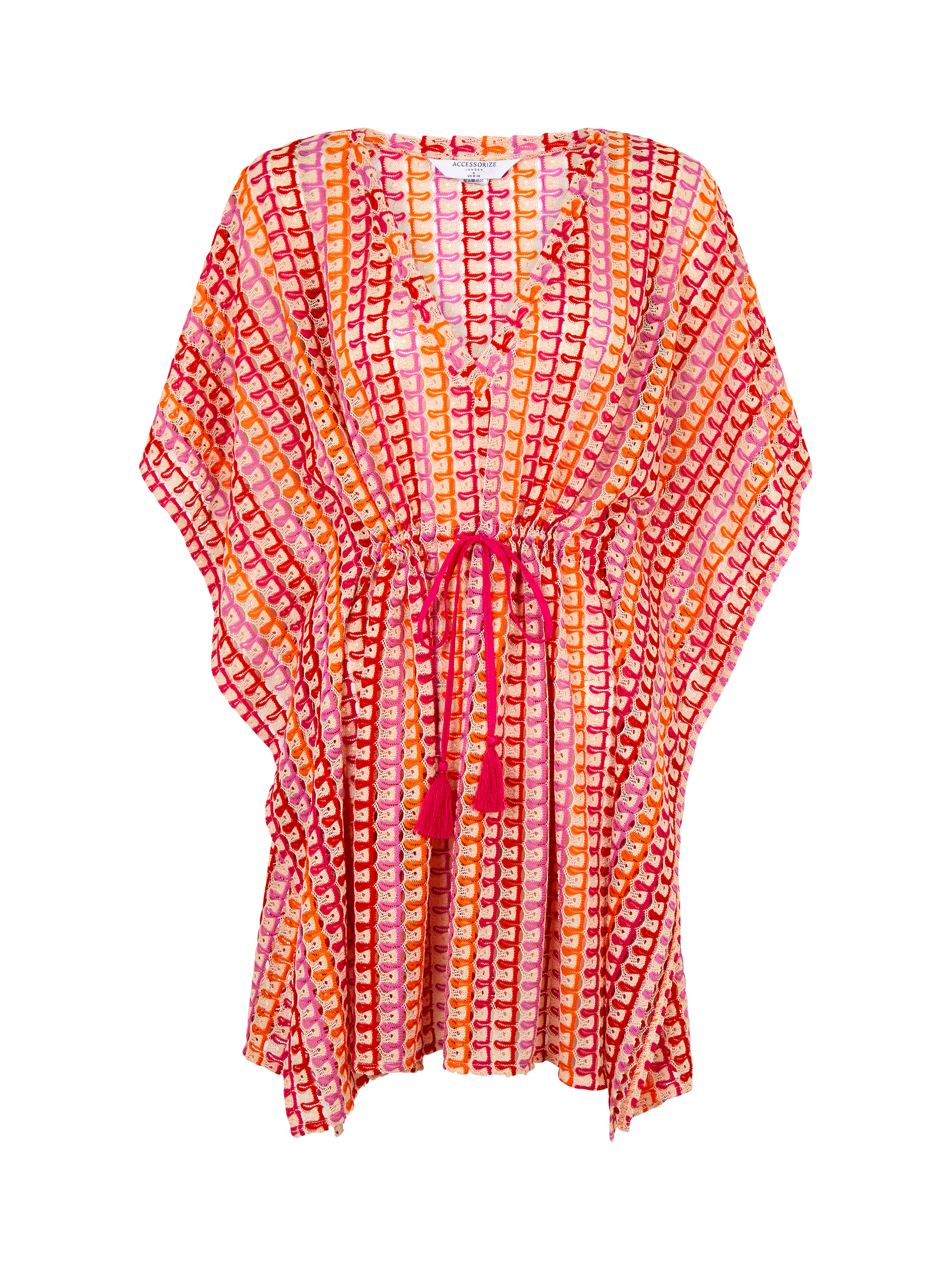 Showcasing wiggly crochet stripes in vibrant sunset-inspired colours, this kaftan features floaty sleeves, a V-neckline and tassel cords to cinch the waist.