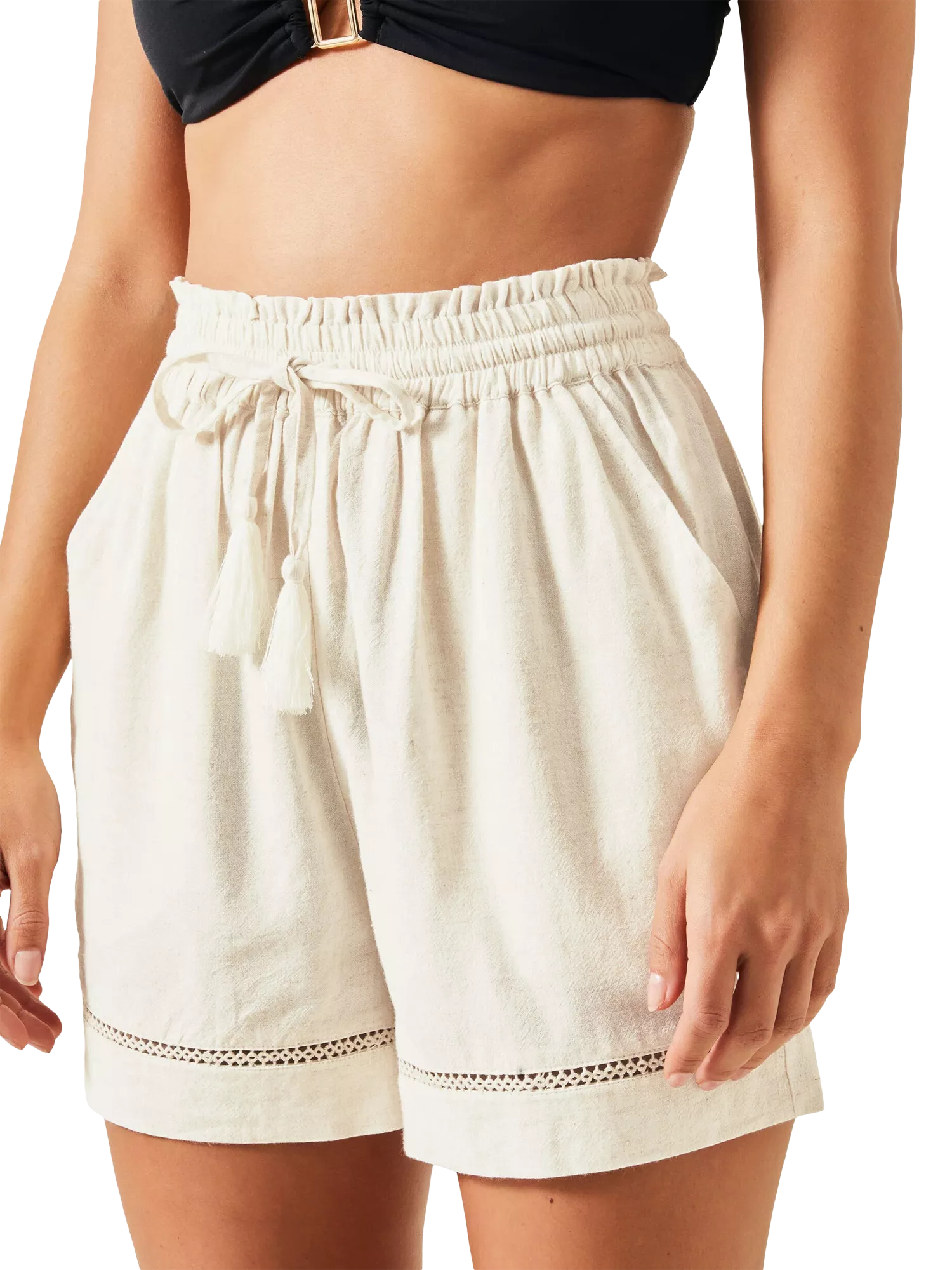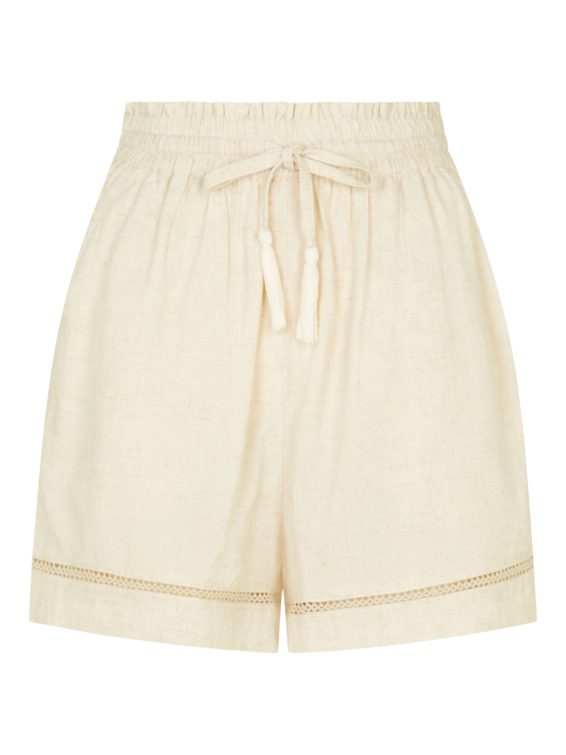 Perfect for slipping on over swimwear after a day of tanning by the beach. These comfy shorts are designed in a lightweight viscose and linen blend, with a comfy stretch waistband and broderie anglaise cuffs to finish.