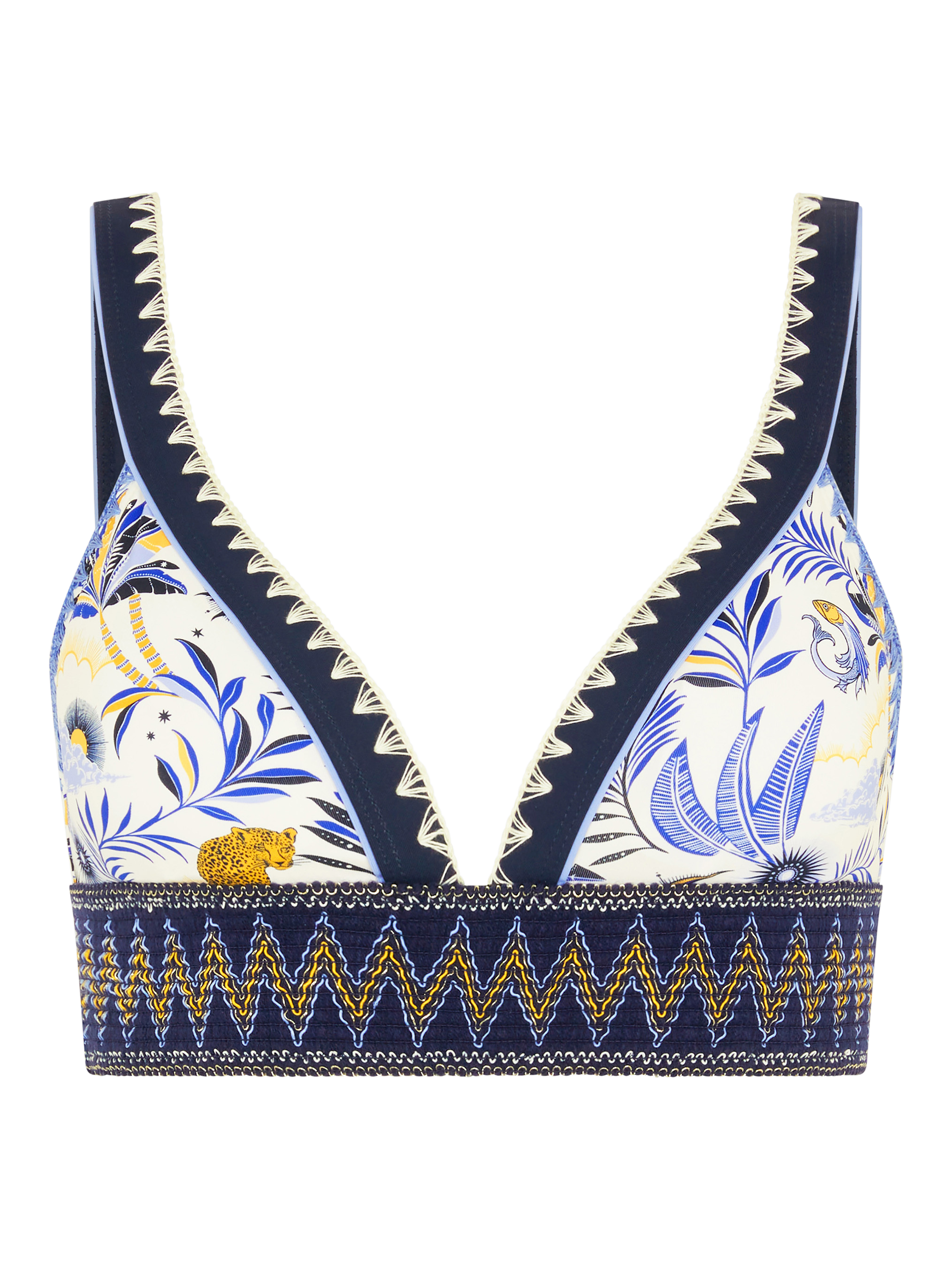This bikini top features a celestial print and geometric bands.