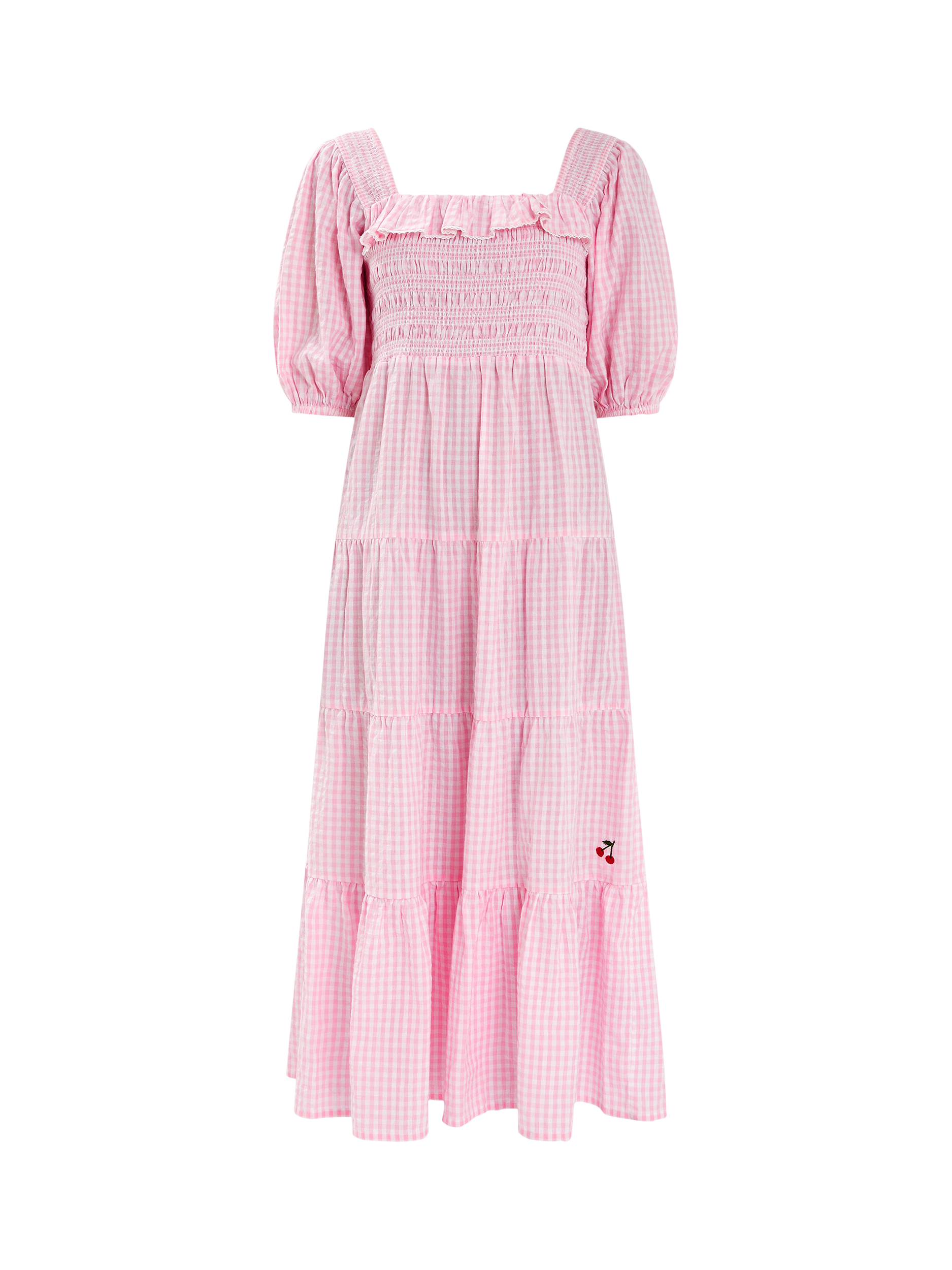 Perfect for literally any plans that involve basking in the sunshine, this dress is made from pink gingham cotton with a tiered hem that falls just above the ankles. It's designed with a smocked bodice, puff sleeves and a frilly square neckline to finish. A cute embroidered cherry stitched to one side finishes it off nicely.