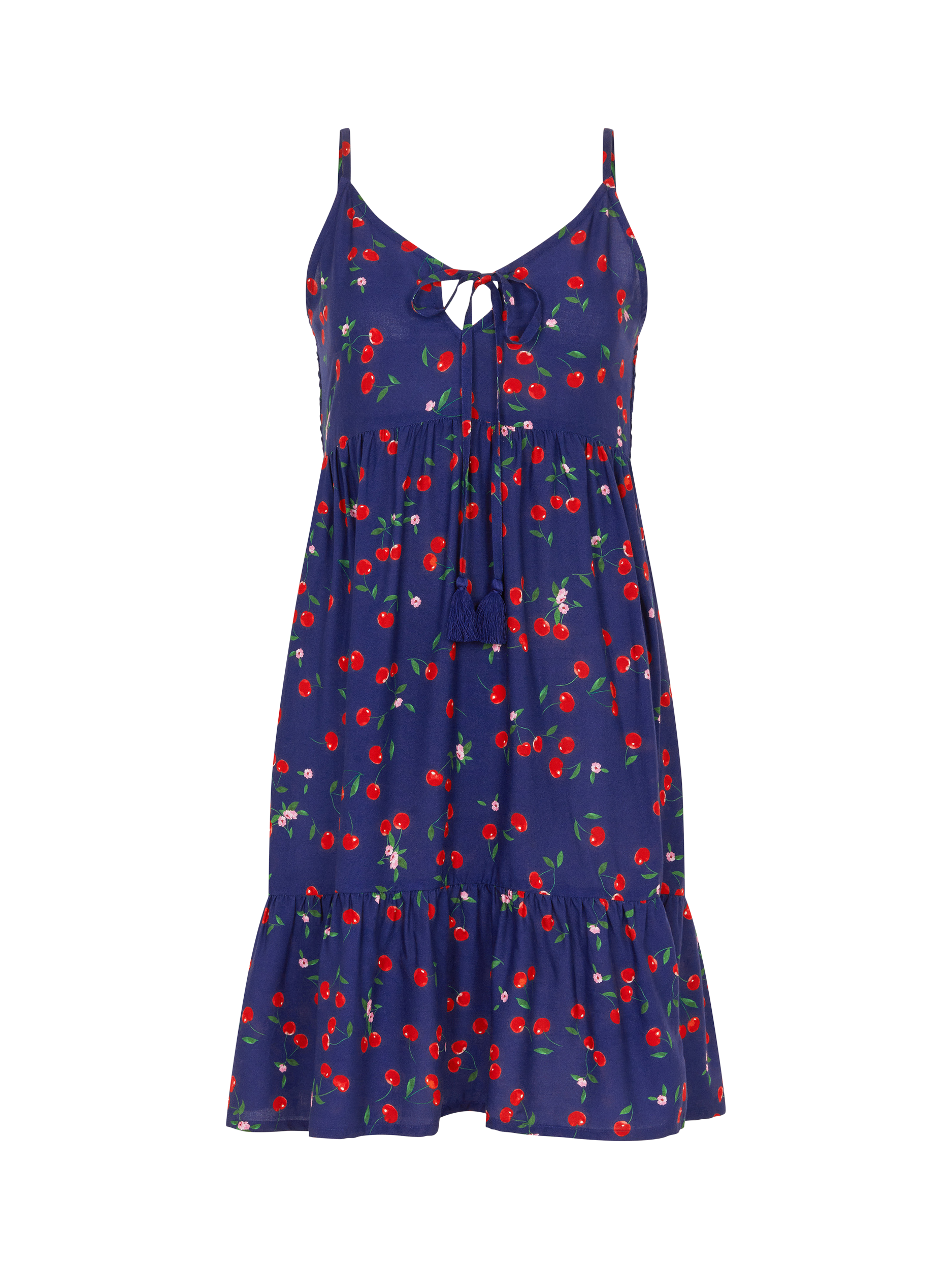 Printed with sweet cherries and dainty flowers, this mini dress is designed with a tassel tie at the neck and a floaty hem that falls above the knees.
