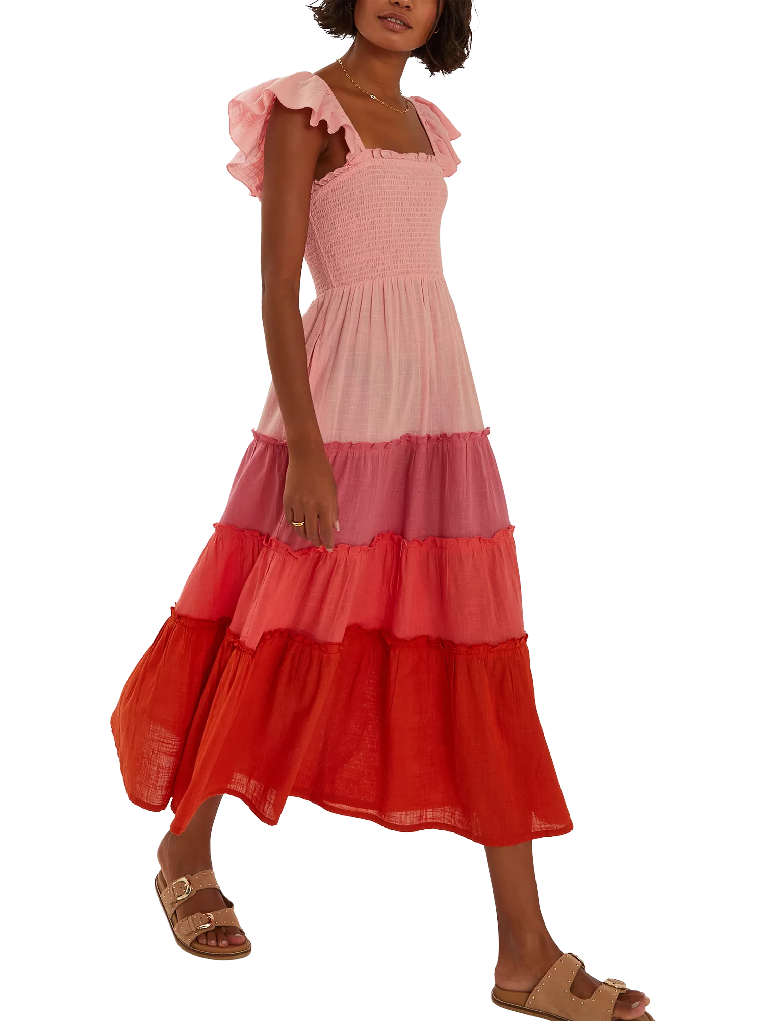 A timeless pick offering maxi-mum summer style. Showcasing different shades of pink and red, this pure cotton sundress is designed with a smocked bodice, fluttery sleeves and colourful tiers that float to a maxi length. Just add sandals or trainer, and you're good to go.