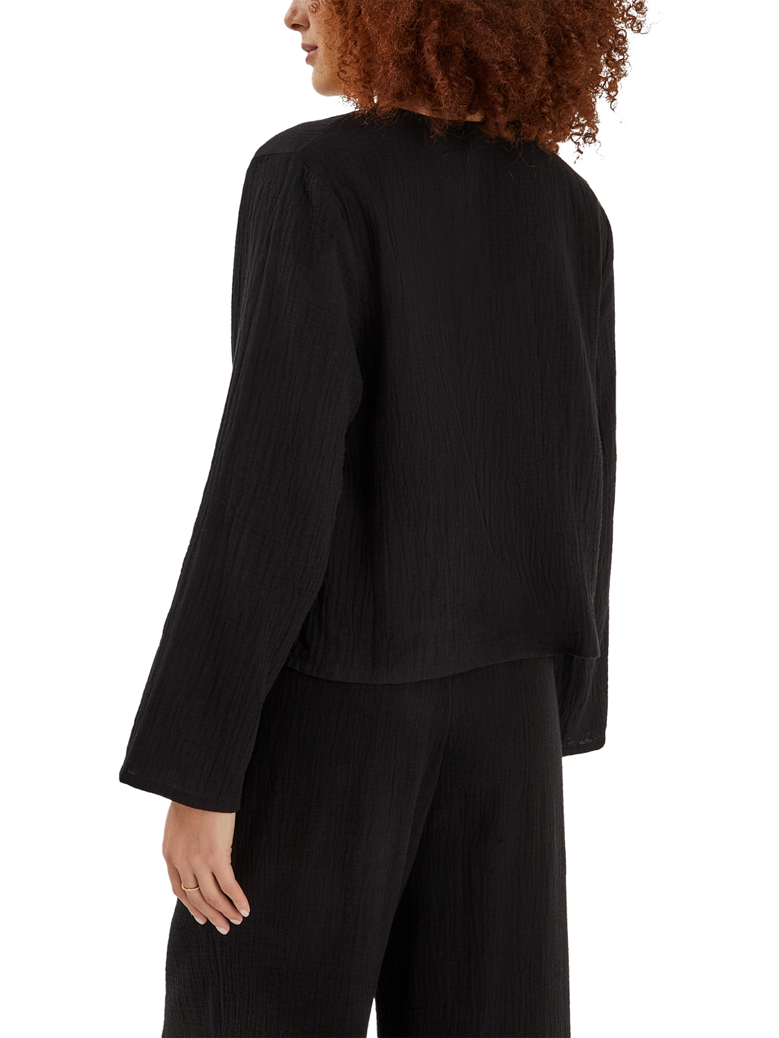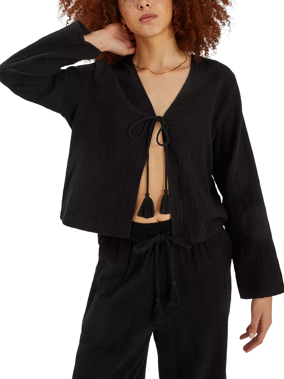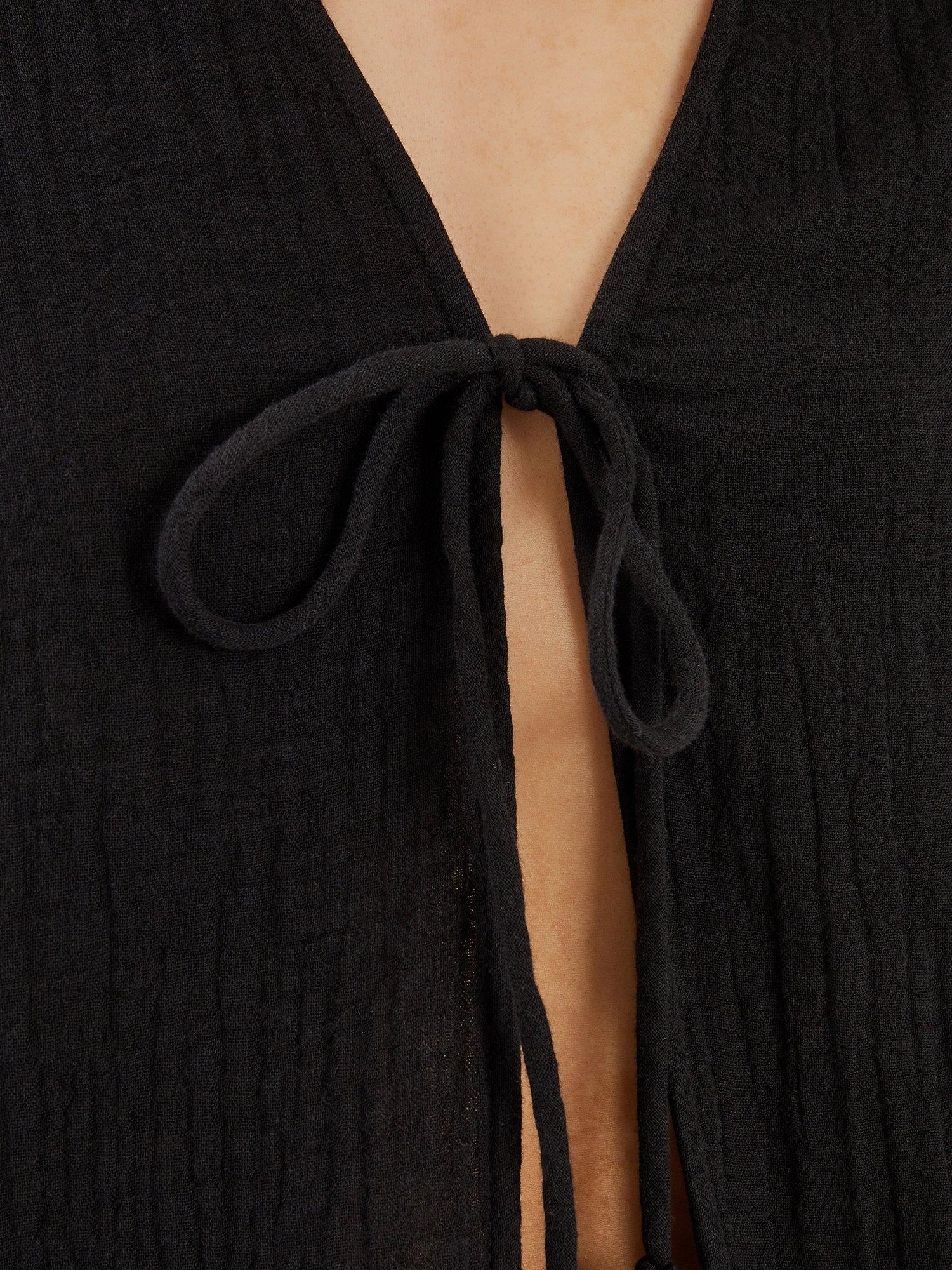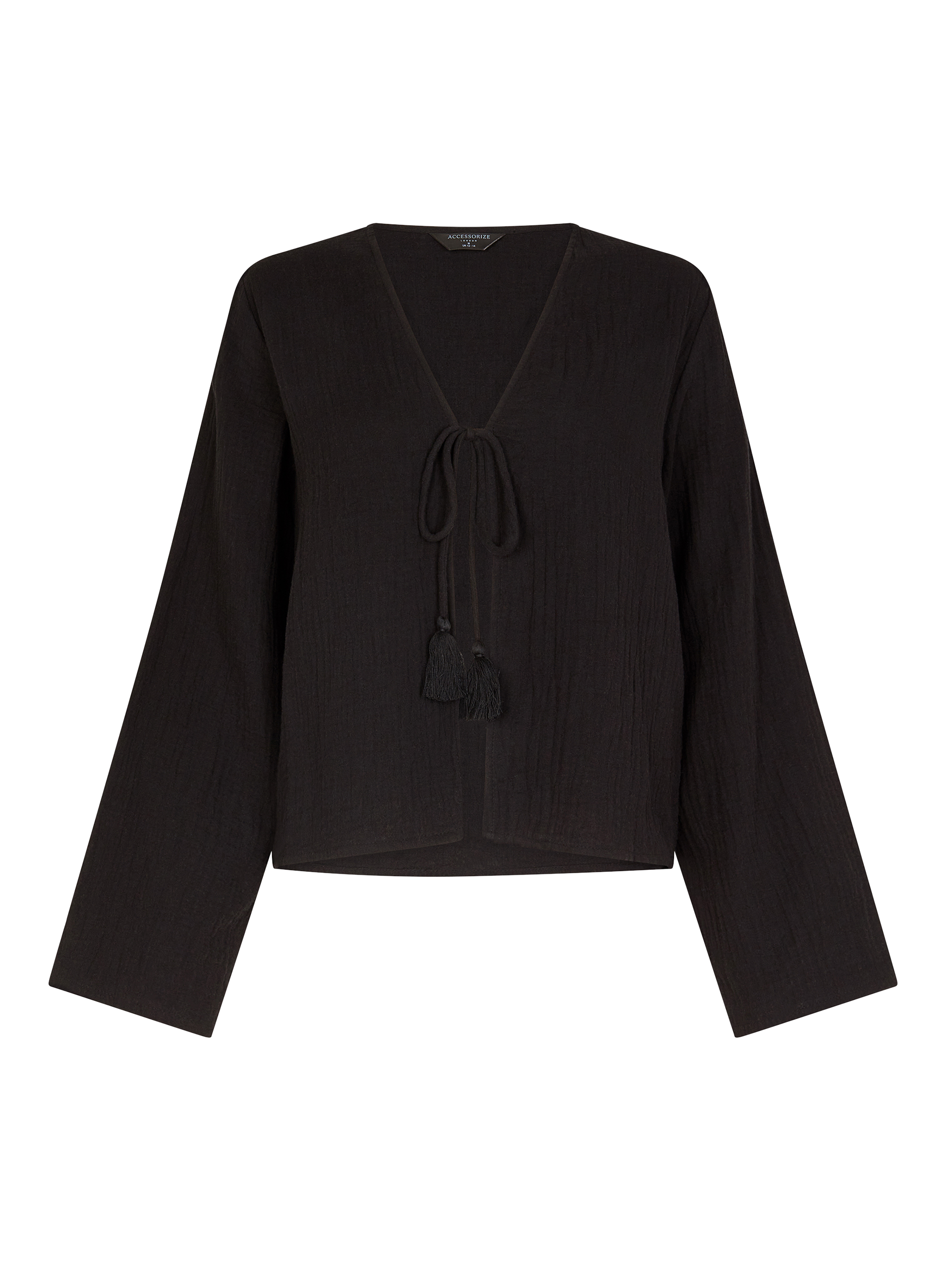 Crinkly cotton blouse with long sleeves and finished with tassel cord fastenings at the V-neckline.