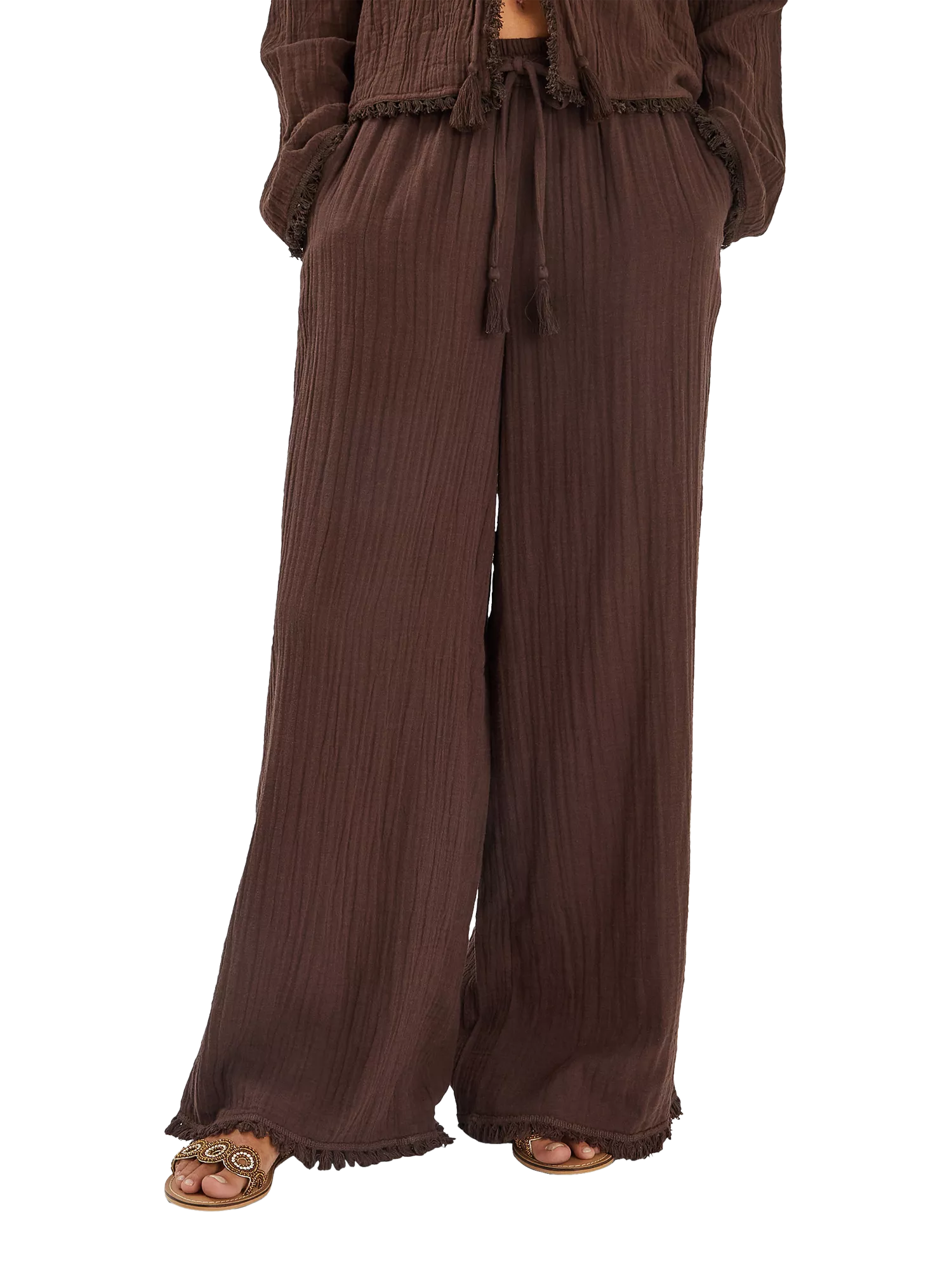 Designed in breathable cotton, these wide-leg trousers feature a tassel tie at the waist. A matching top is available.