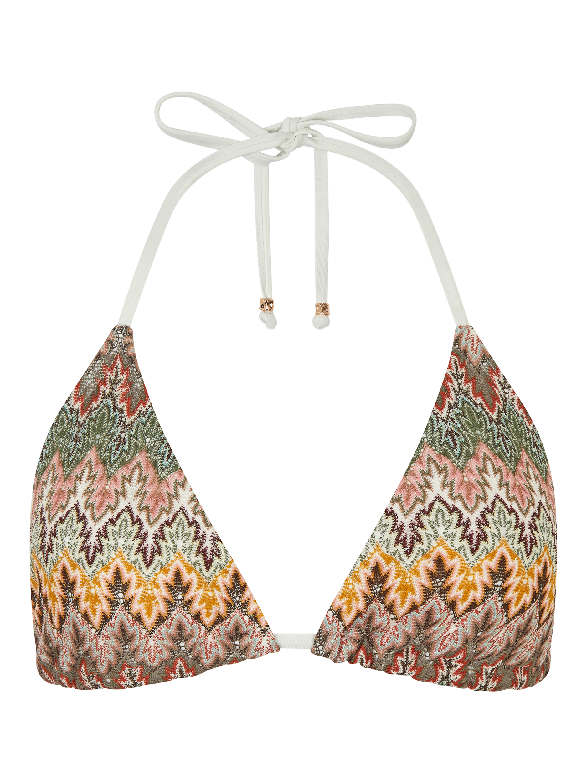 Say hello to your new suitcase staple. Stitched with a decorative crochet pattern in earthy tones, this bikini top will add a retro vibe to your holiday looks. Matching bikini bottoms available.