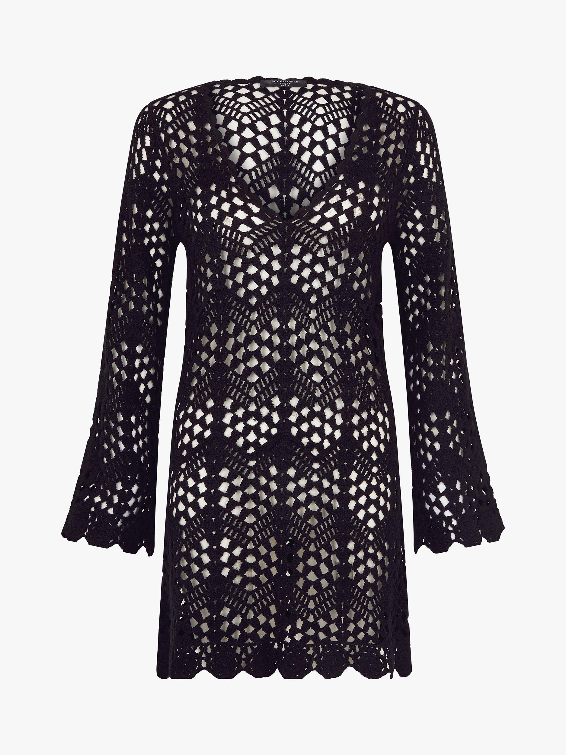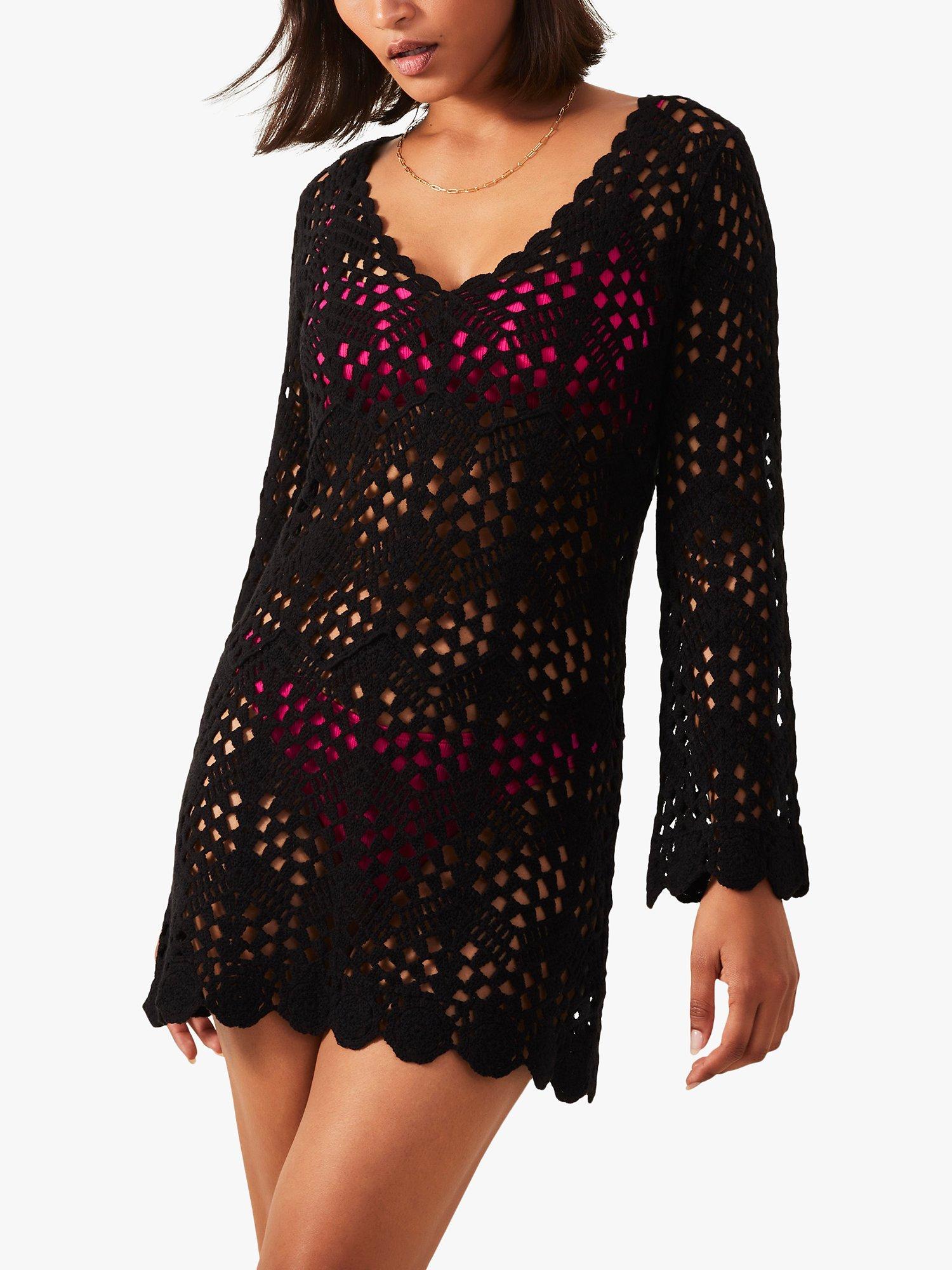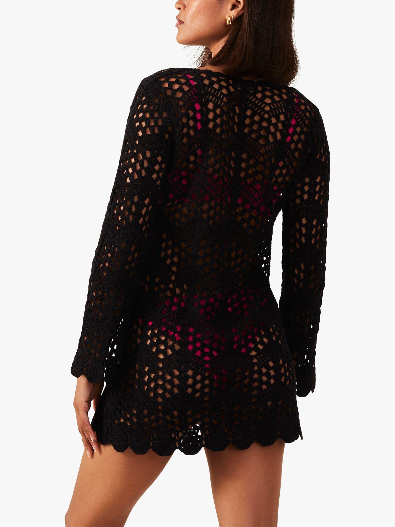 Holiday wanderlust: crochet lace lends this cover up an airy fabrication to layer over your swimsuit. Designed with a v-neckline, long sleeves and mini length, its sheer finish allows your bright swimwear to shine through underneath. Style with platform wedges and a floppy hat to take it to the beach bar.