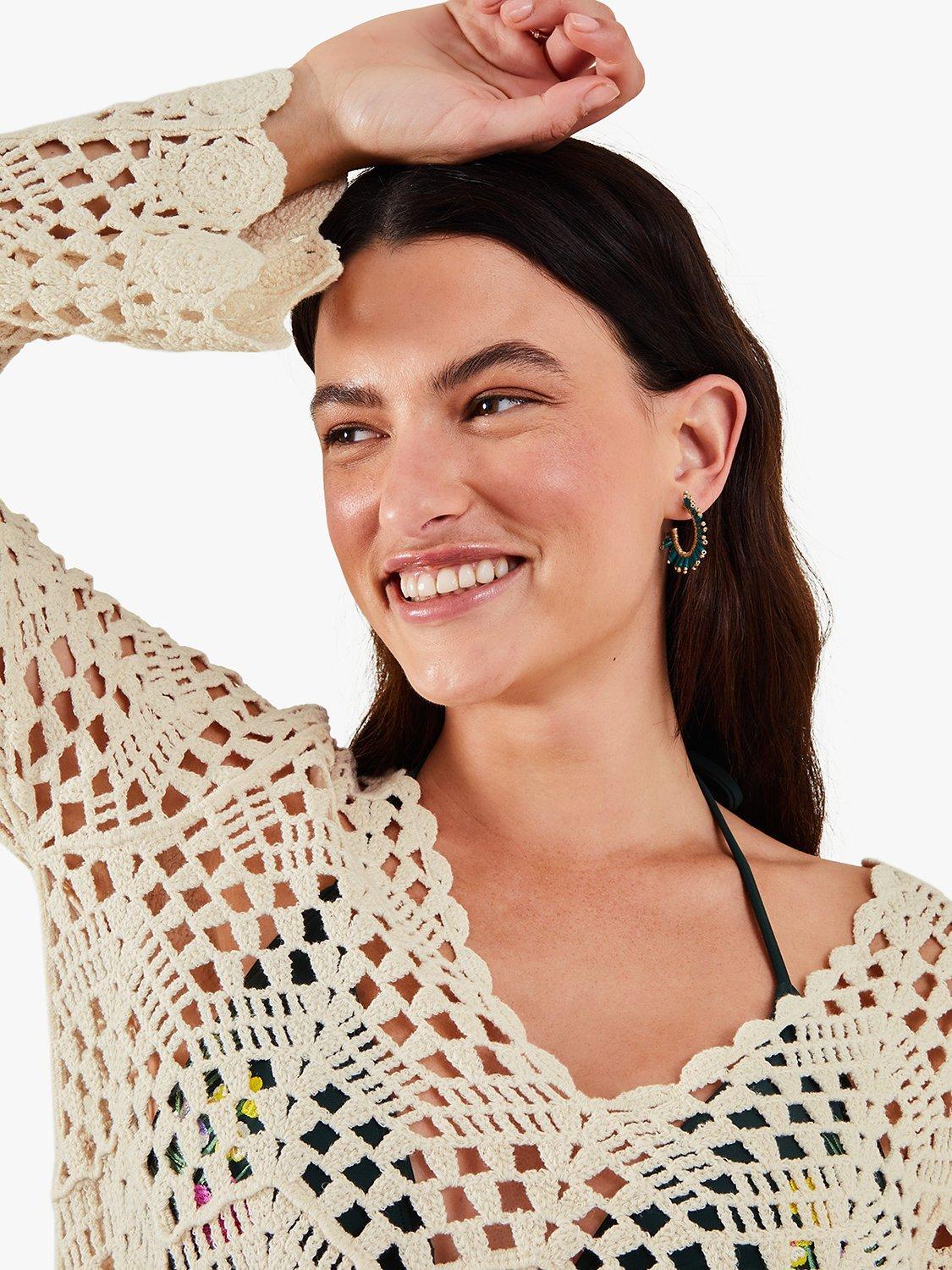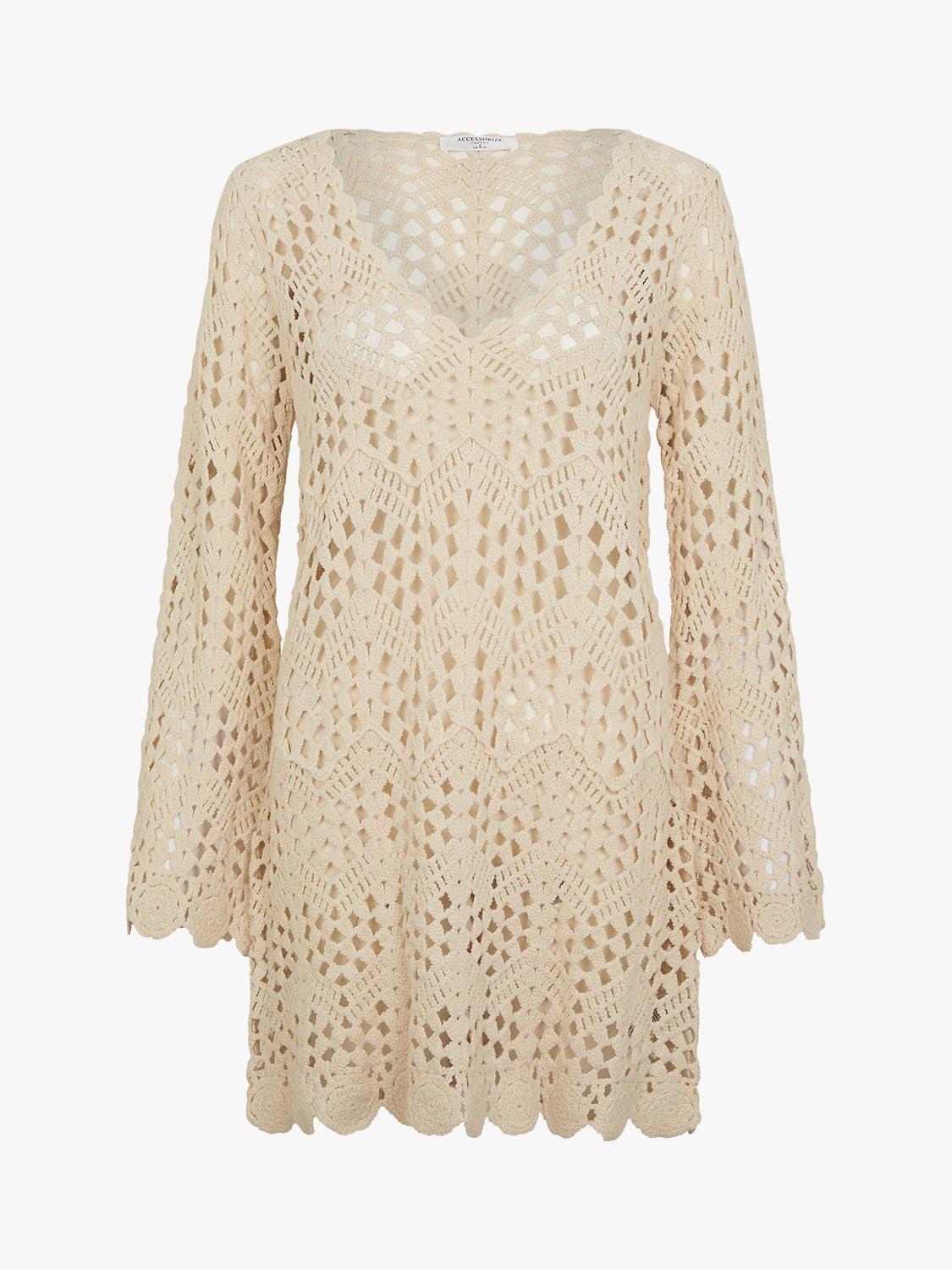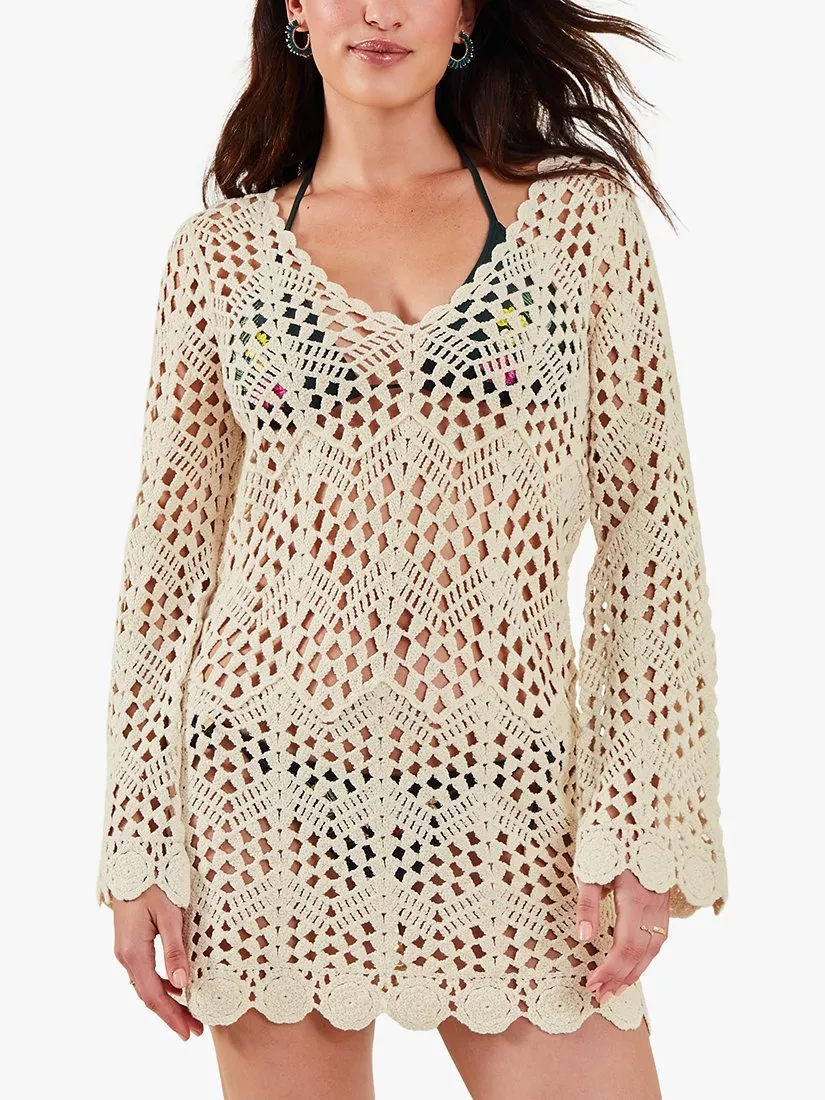 Holiday wanderlust: crochet lace lends this cover up an airy fabrication to layer over your swimsuit. Designed with a v-neckline, long sleeves and mini length, its sheer finish allows your bright swimwear to shine through underneath. Style with platform wedges and a floppy hat to take it to the beach bar.