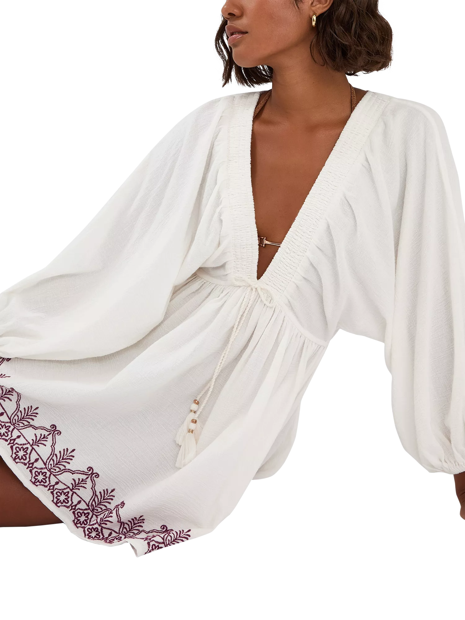 Mini dress with a V-neckline and long sleeves, plus embroidery on the hem to finish.