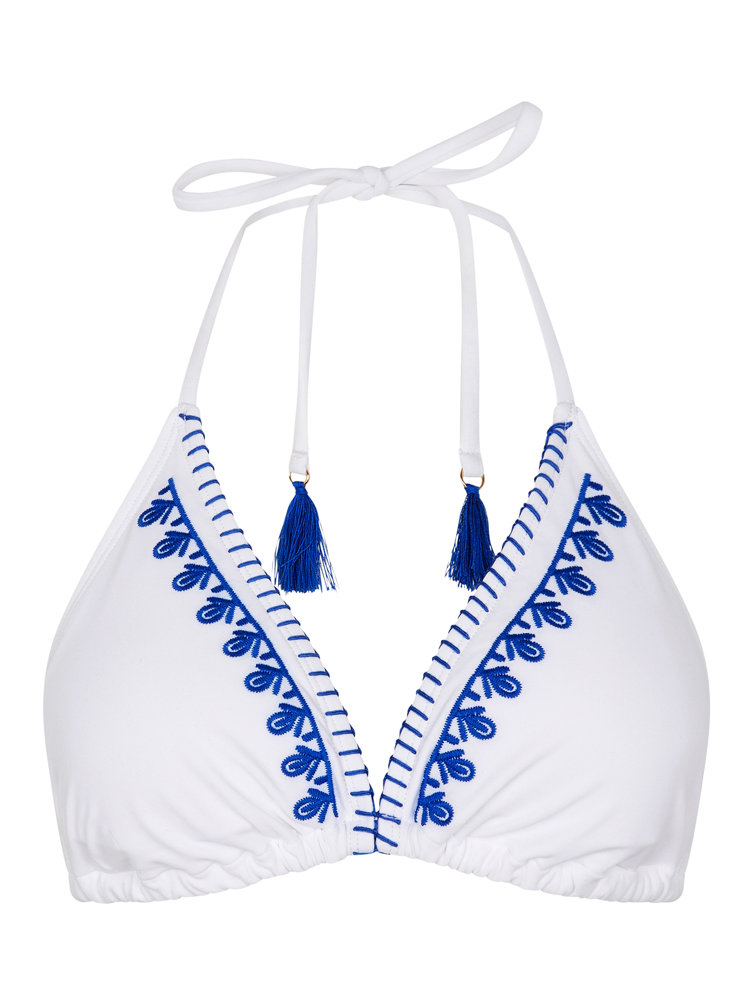 In colours to match the scenic buildings of Santorini, this bikini top is perfect for your Euro Summer plans. It's designed with triangular cups, halterneck tie fastenings and blue embroidery to match the tassel trims. Matching bikini bottoms are available.