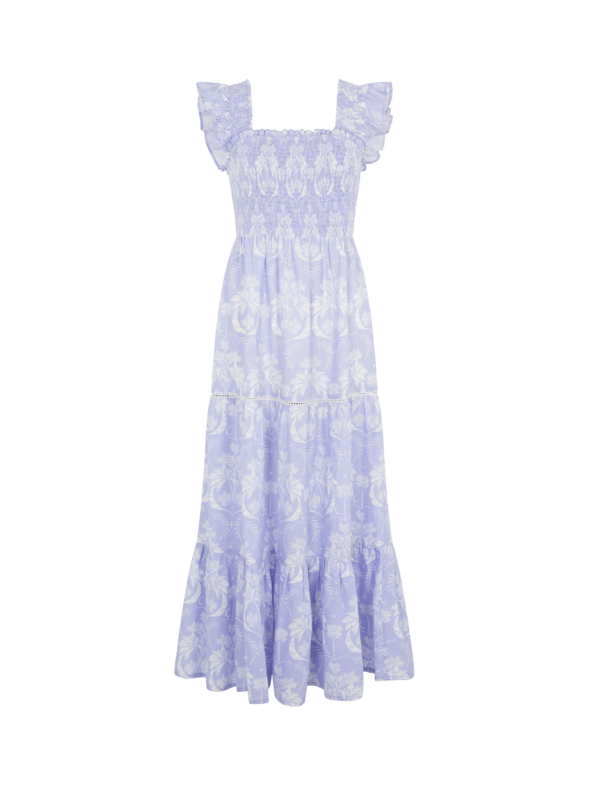 Crafted from lightweight cotton, this midi dress has a feather print and is designed with frilly shoulder straps and a smocked bodice. Striking the perfect balance between comfy and stylish, you just need to add sandals.
