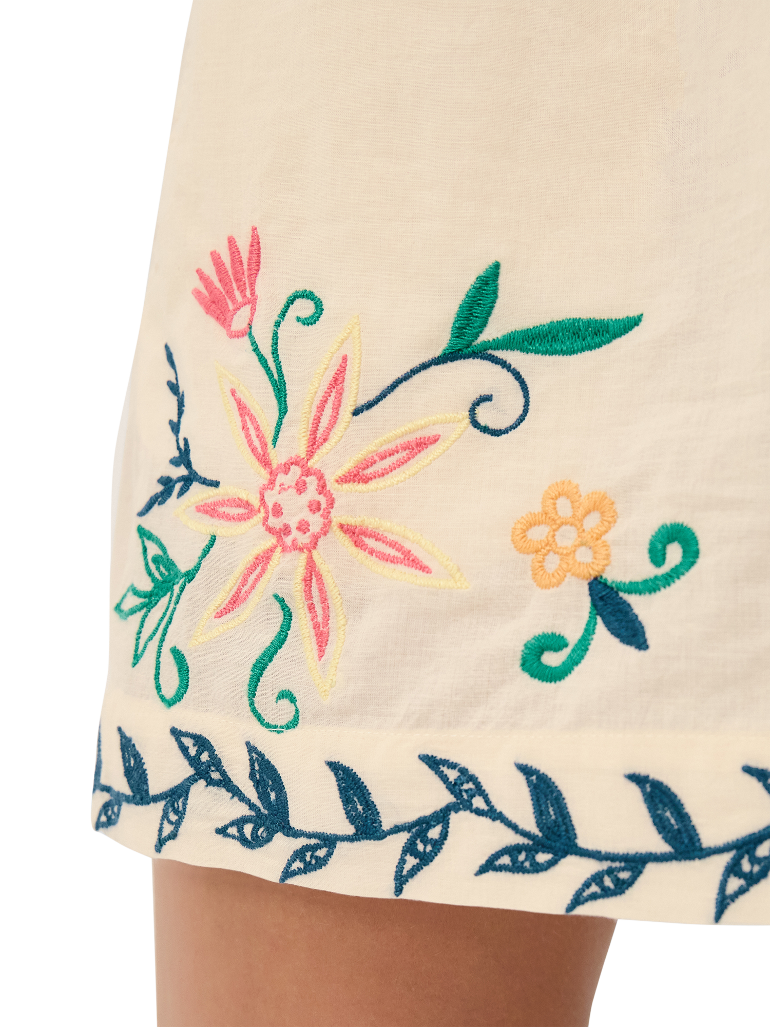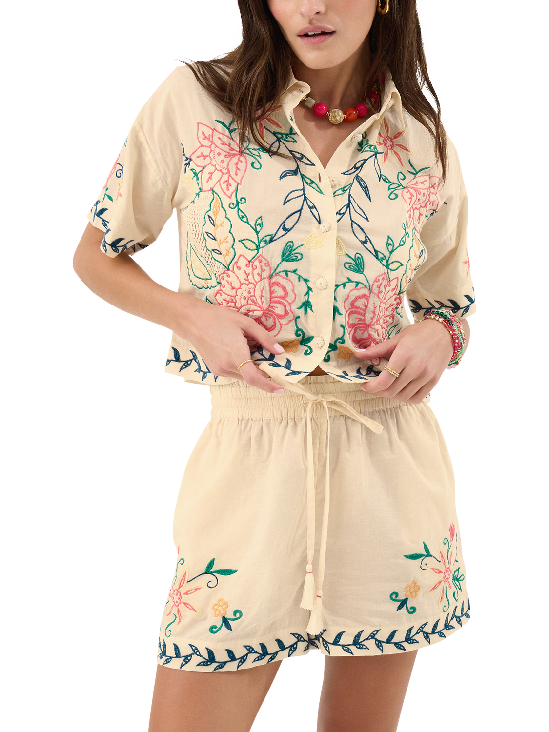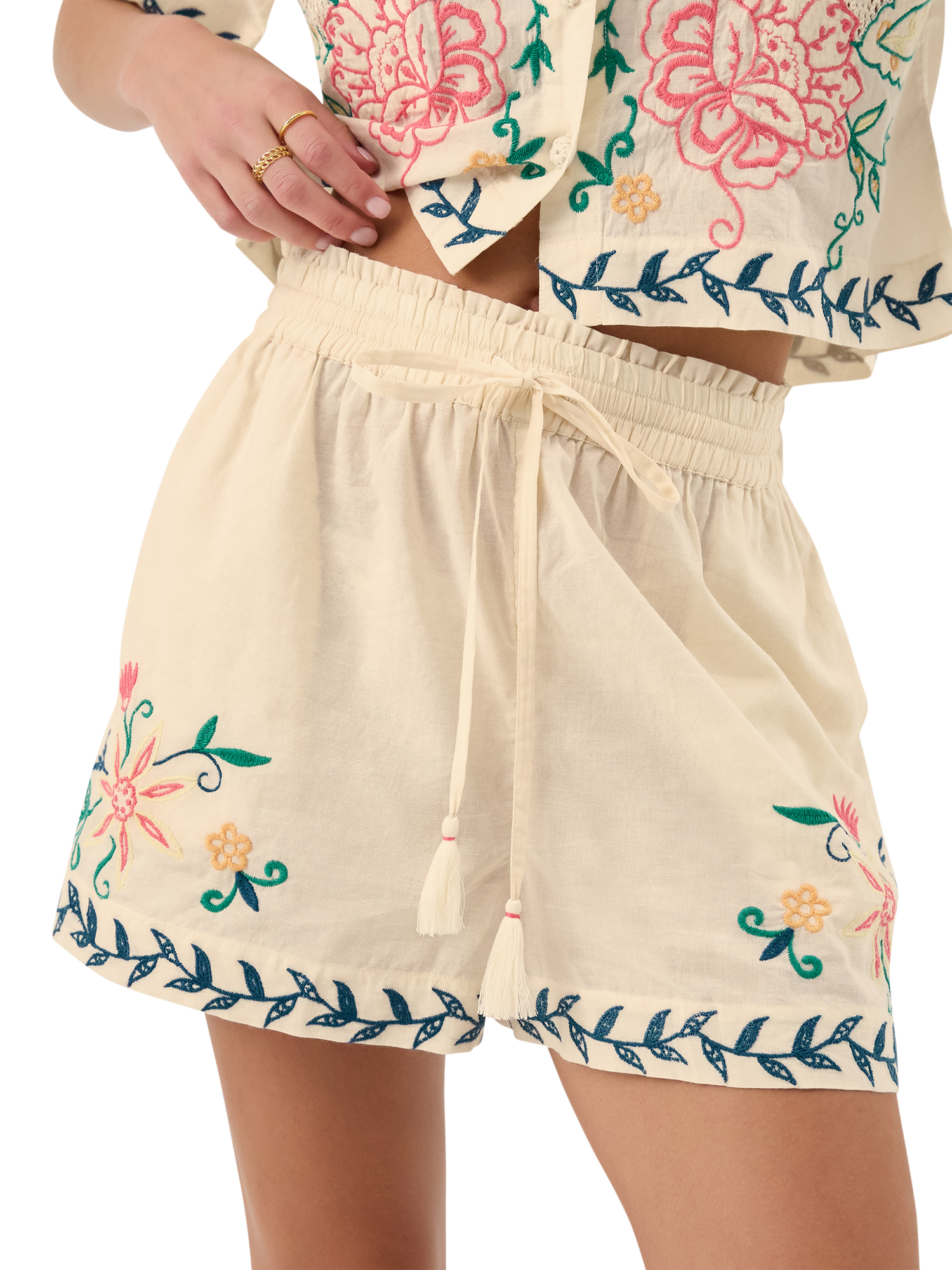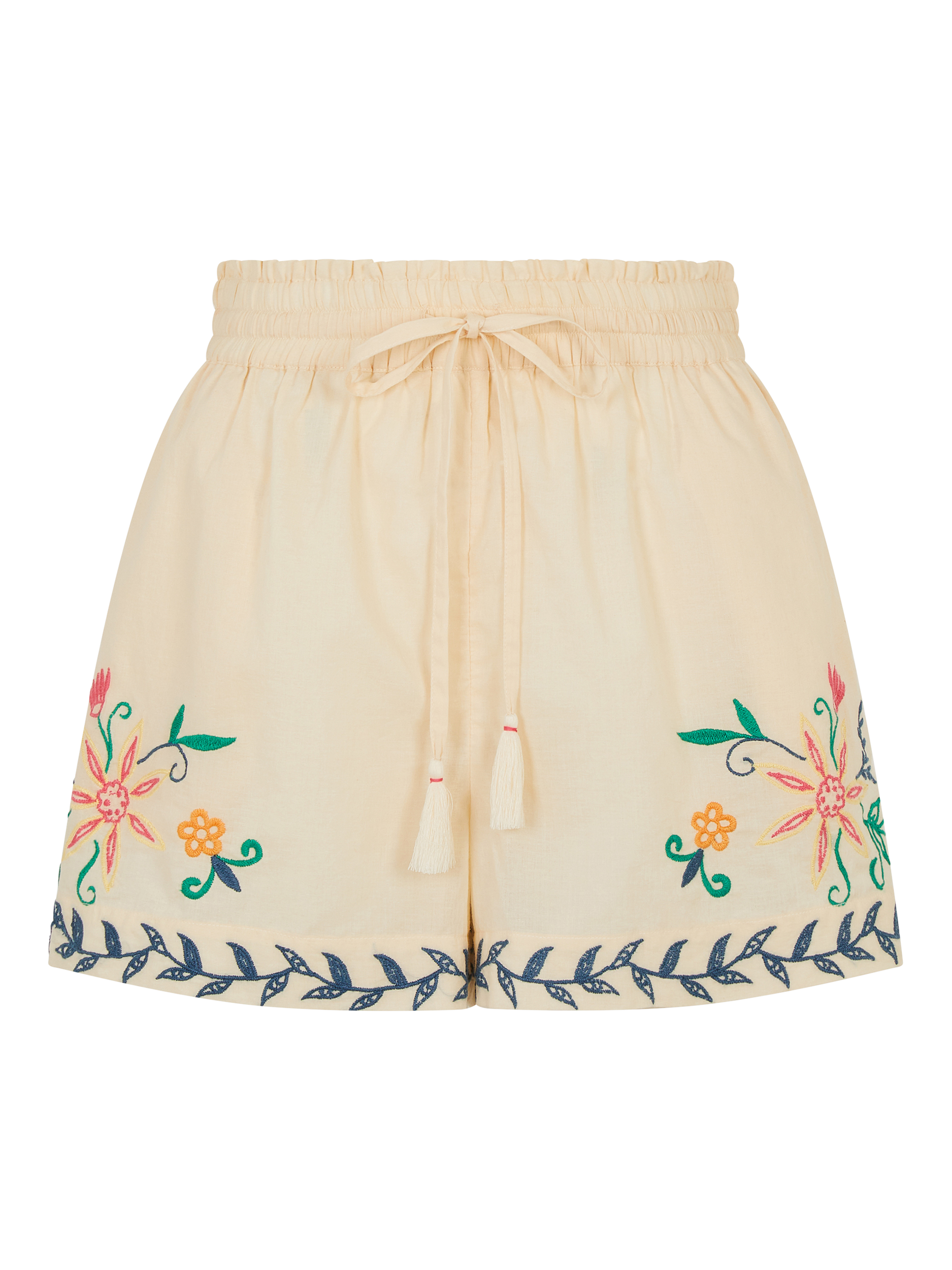 Designed in cotton with a stretchy drawstring waist to wear up high, these shorts are stitched with colour pop floral embroidery and navy vines winding round the cuffs.