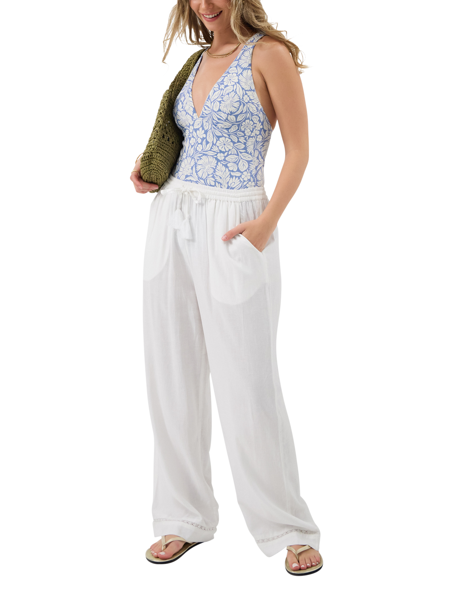 Patterned with florals over the sky blue backdrop, this swimsuit is finished with a plunge neckline and crossover back straps.