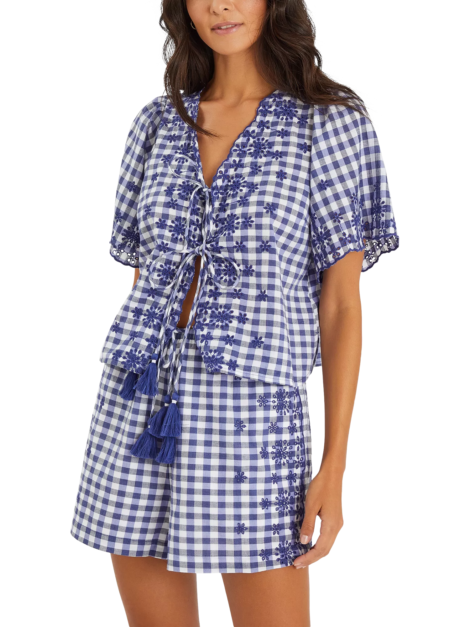 Statement gingham for summertime? A must. Brimming with boho charm, these shorts are decorated with symmetrical floral and leaf embroidery with tassels to the stretch waist.