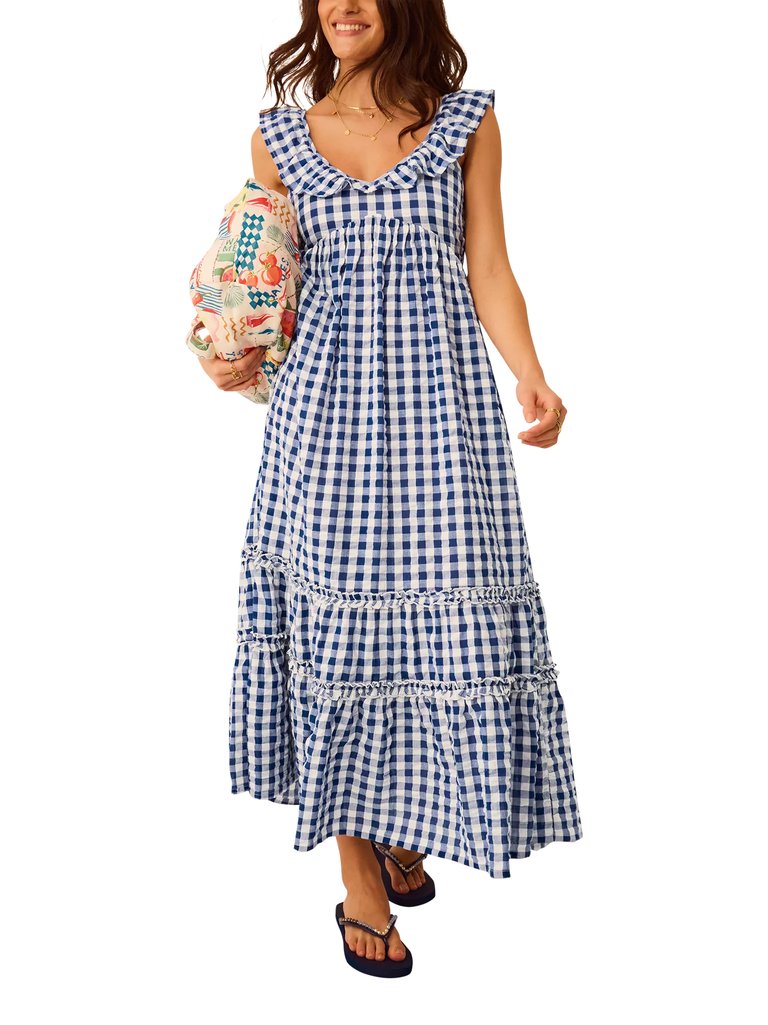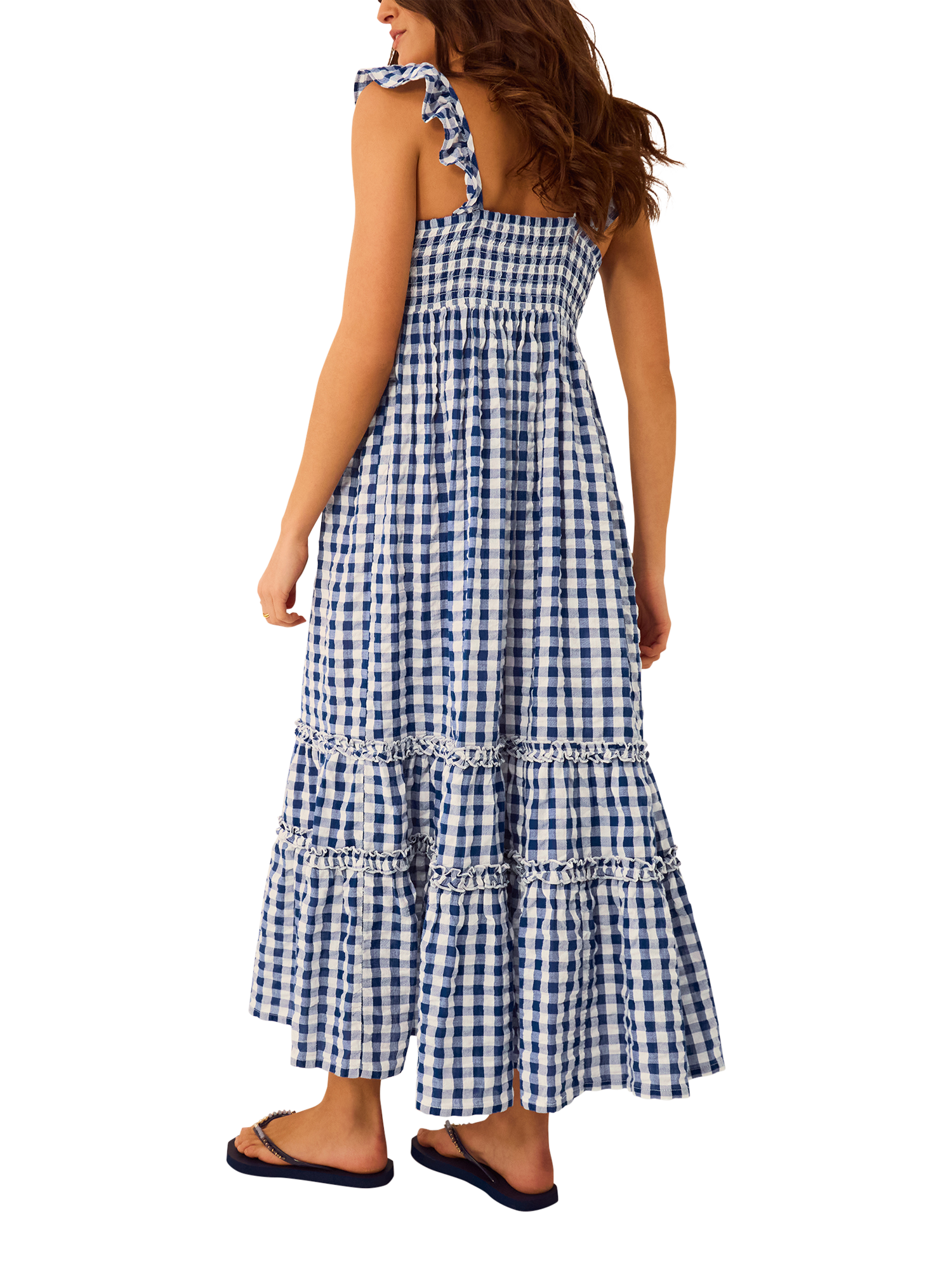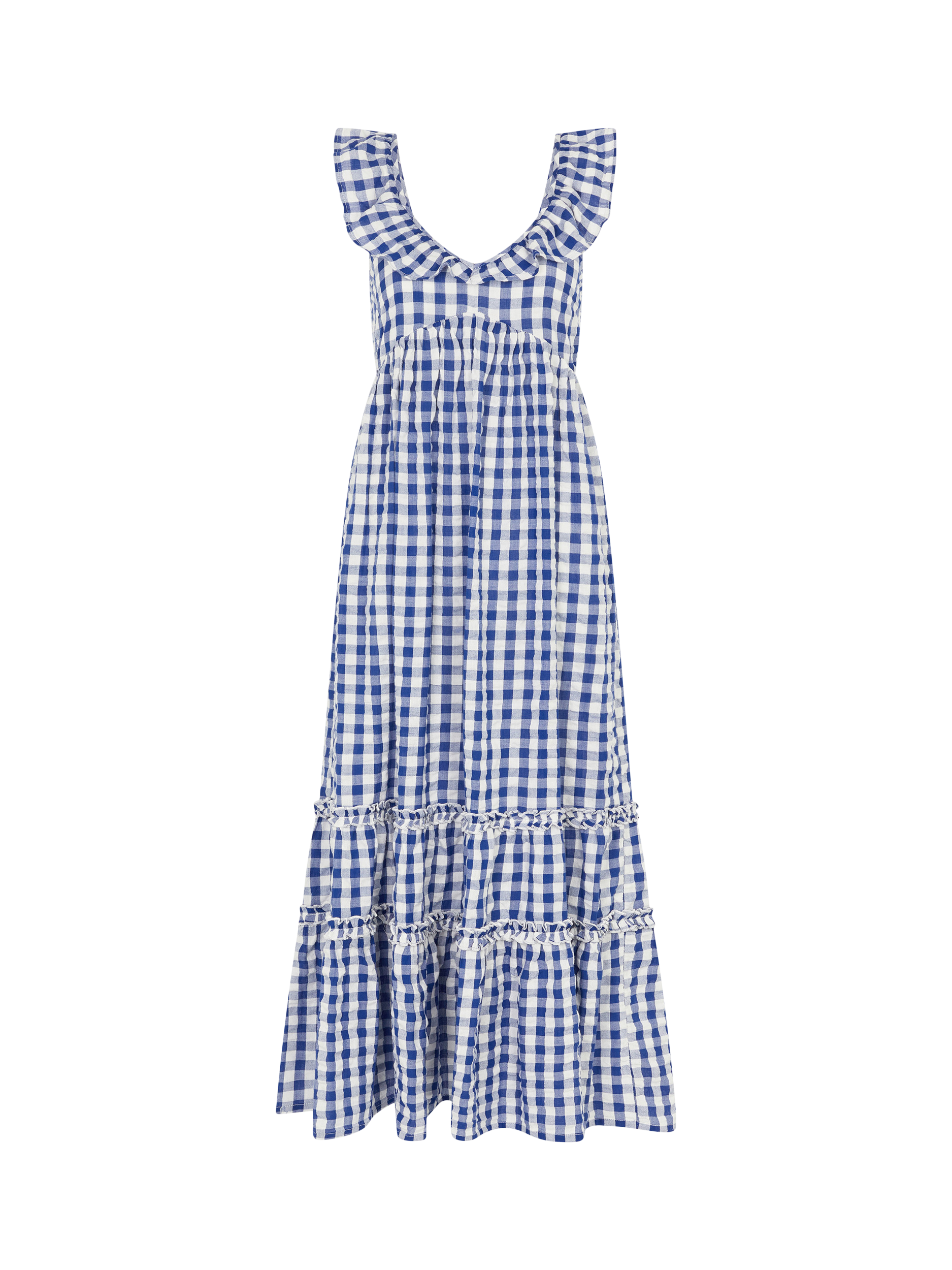 Patterned in a gingham print that never goes out of style, this midi dress is designed with ruffled detailing on the straps and tiers.