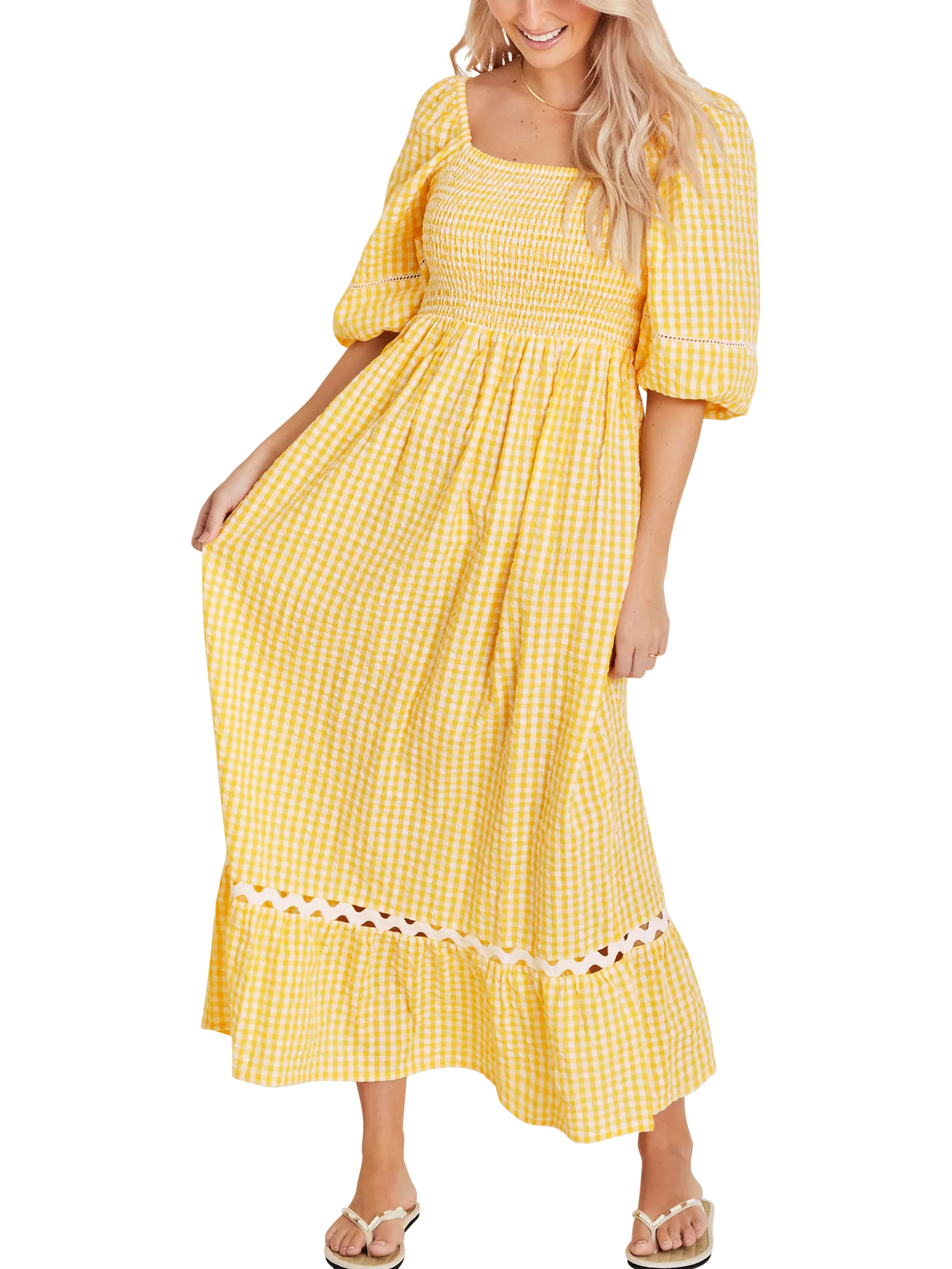 You bring the picnic, we'll bring the gingham. Featuring puff sleeves, a shirred bodice and maxi-length skirt with ricrac detailing to the hem, this dress is a number one summer pick.