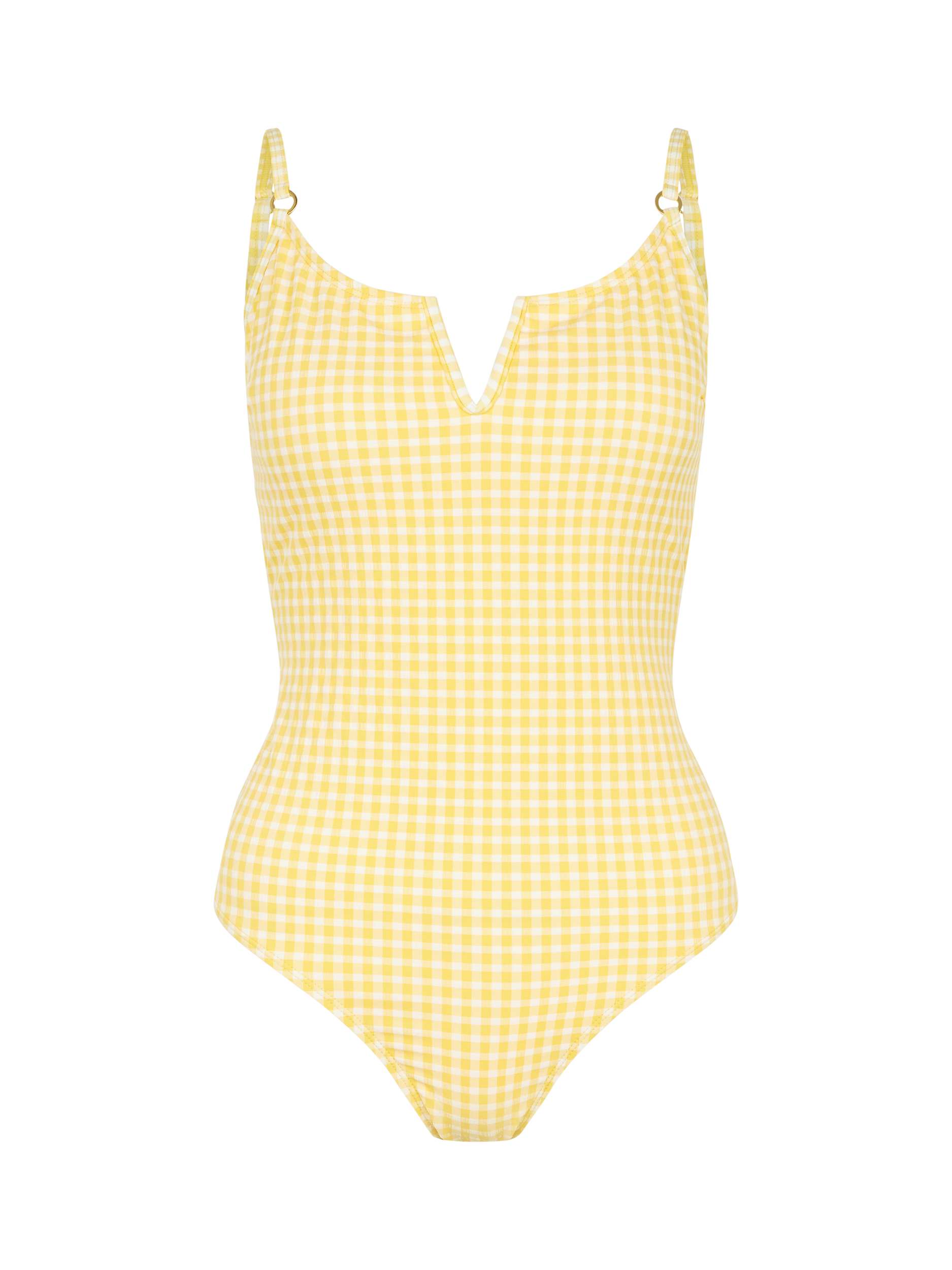In a shade to match the sunshine, this swimsuit is designed with a mini v-front and cute gingham pattern. Finished with gold ring details on the adjustable straps.
