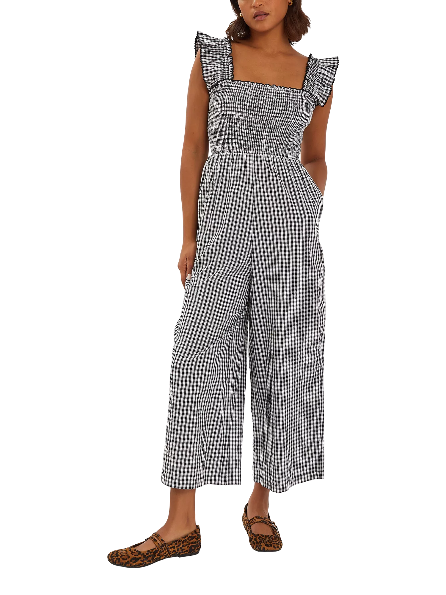 Keep things chic on sunny days with this gingham jumpsuit, featuring a square neck, shirred bodice and wide cut through the leg. Team with white trainers and a straw shoulder bag.