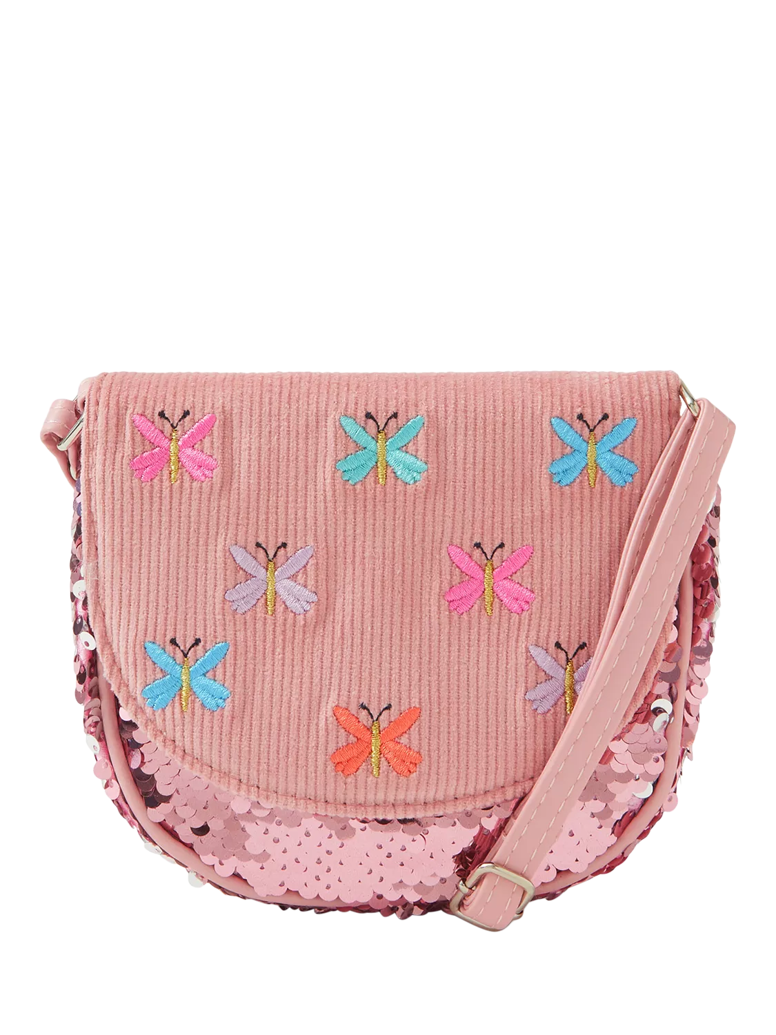 Crossbody bag designed with a fold-over top in corduroy, a sequin finish, and colourful butterfly embroidery to the front. Finished with a magnetic button fastening.