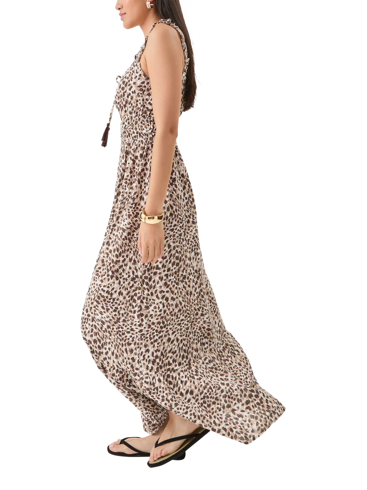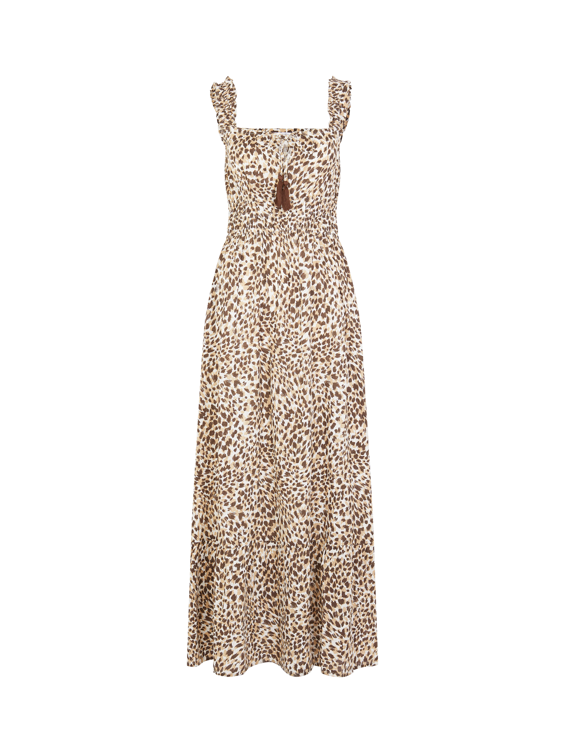 Made in breathable cotton and covered in leopard print, this dress is the perfect go-to for summer getaways and weekend BBQs. Designed with a sleeveless bodice, drawstring tassels at the neckline and a midi length hem.