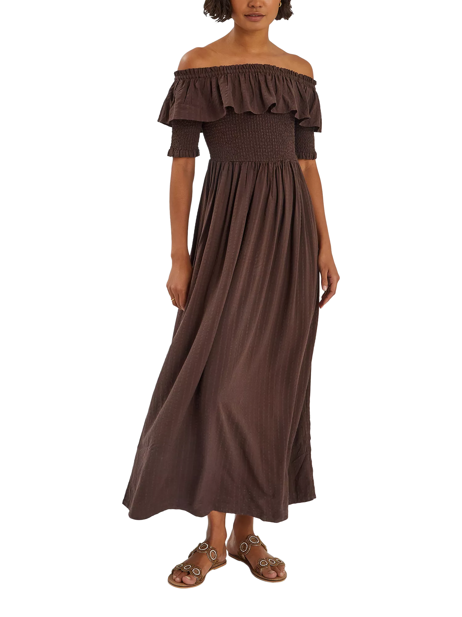 This maxi dress features an off-the-shoulder design that's complemented by a smocked bodice that flows into the sleeves. Finished with frilly detailing.