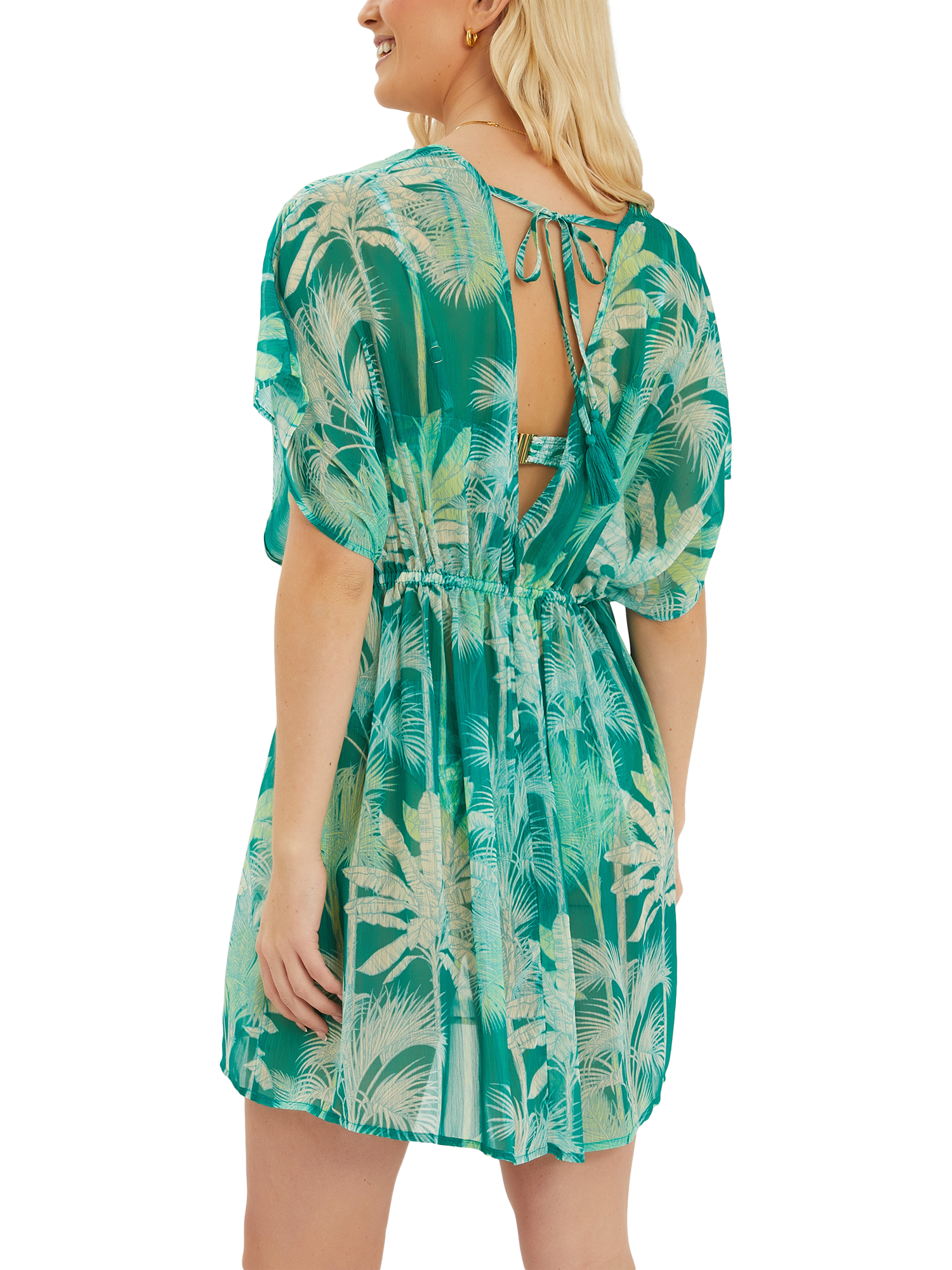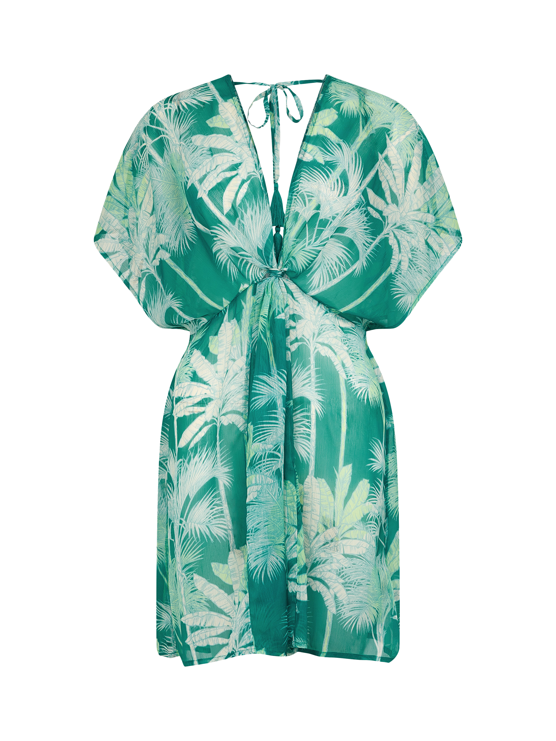 Made for showing off somewhere tropical, this kaftan is decorated with endless palm trees over the green chiffon fabric. Cut with draped sleeves and a mini-length hem.