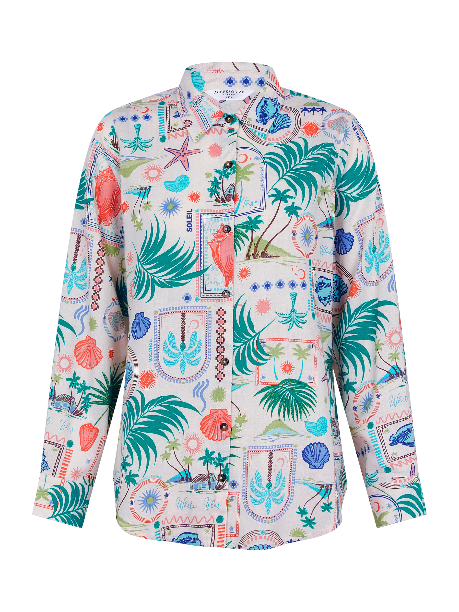 A smart choice for summertime, this shirt is made from a lightweight viscose and linen blend for a breathable finish. Printed with a mix of colourful leaves, seashells and postcard-worthy scenes, it's a style for the maximalist.
