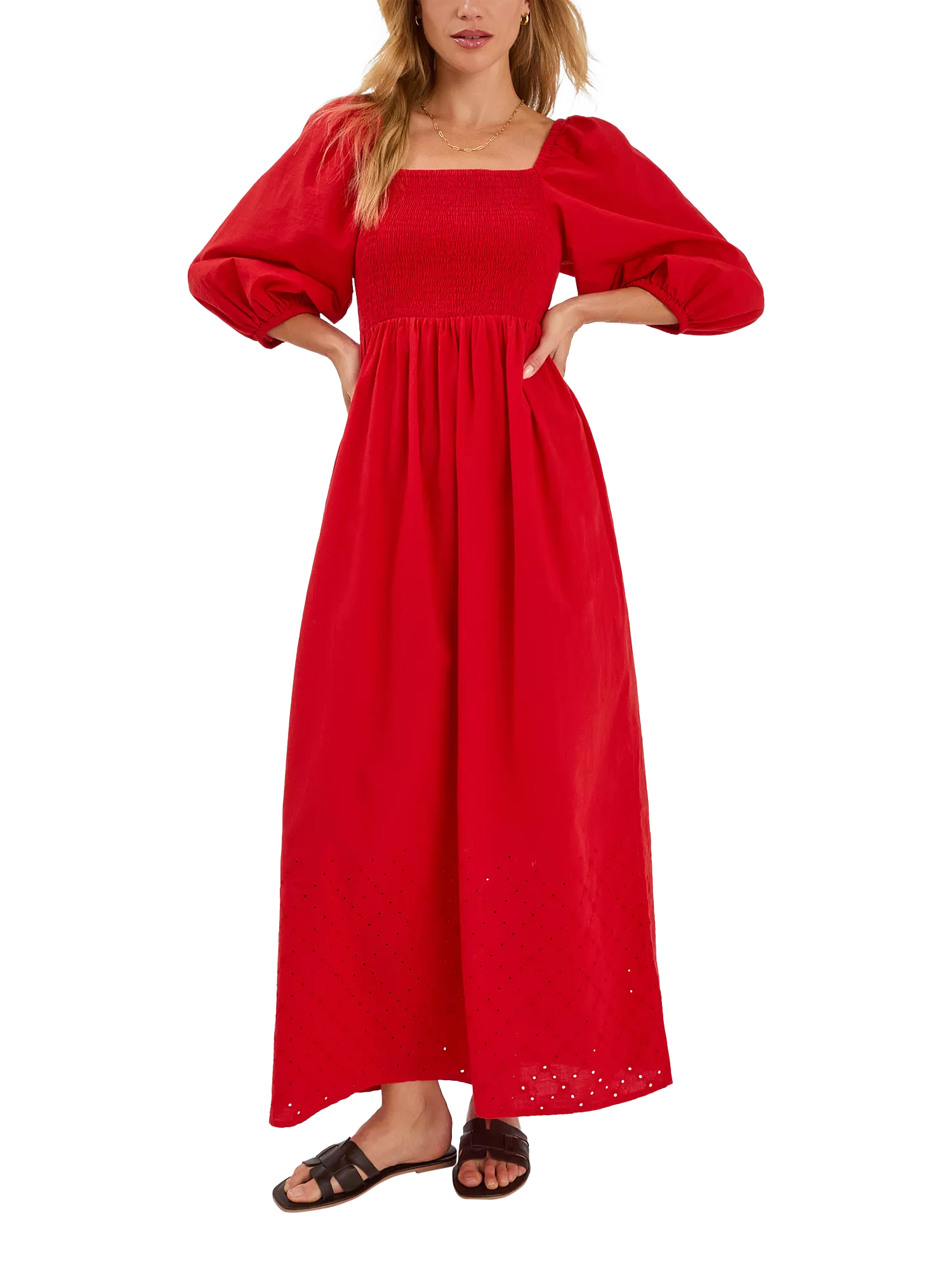 Whisked from breathable cotton, this vibrant red dress is cut with voluminous puff sleeves, a stretchy smocked bodice and swishy maxi-length hem.