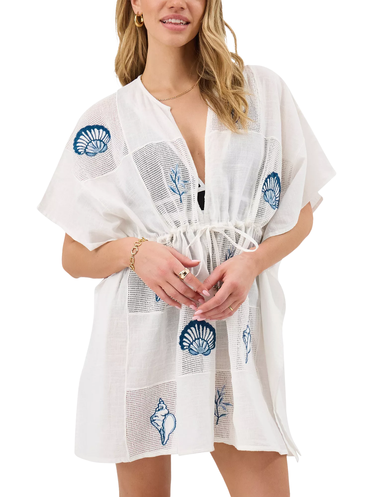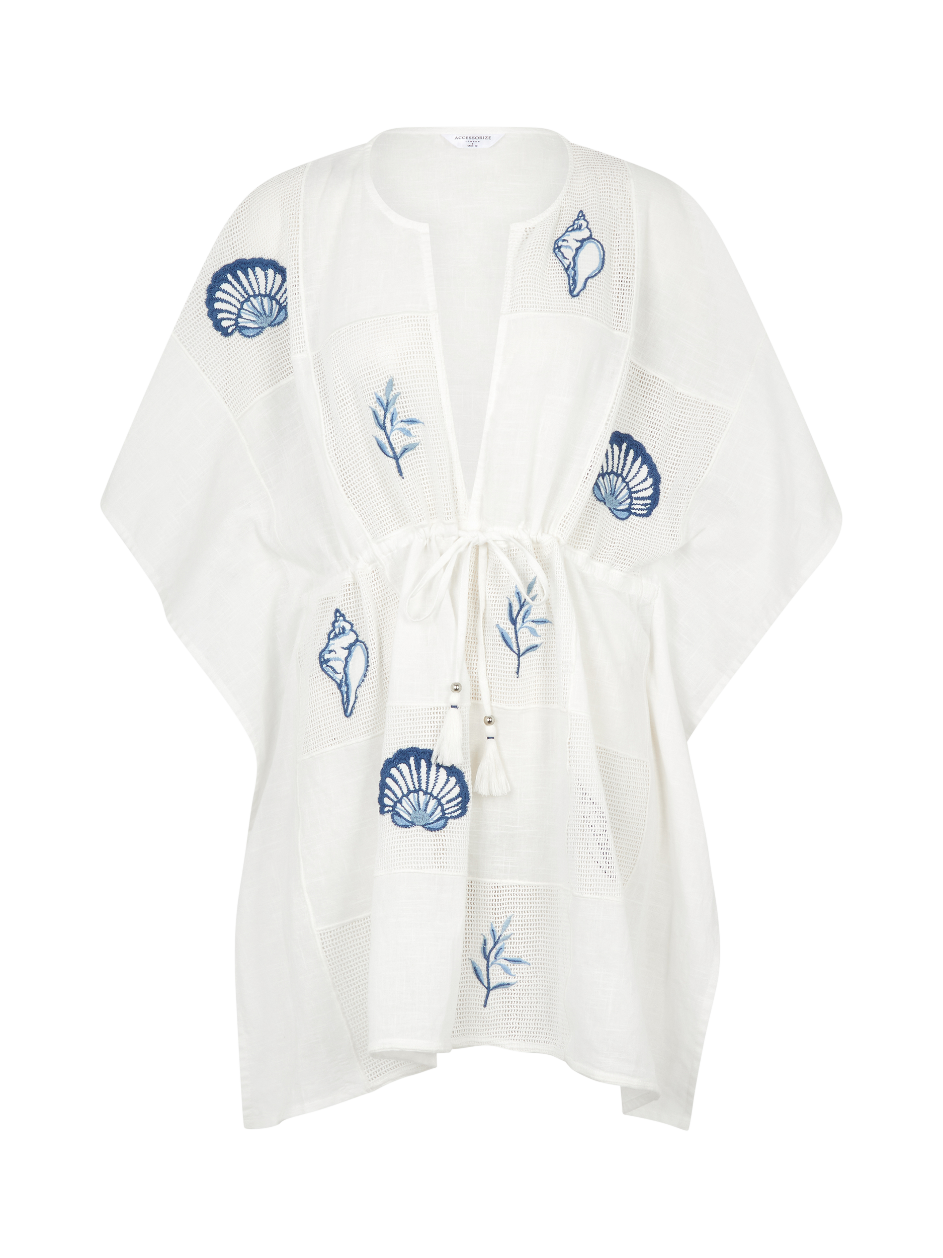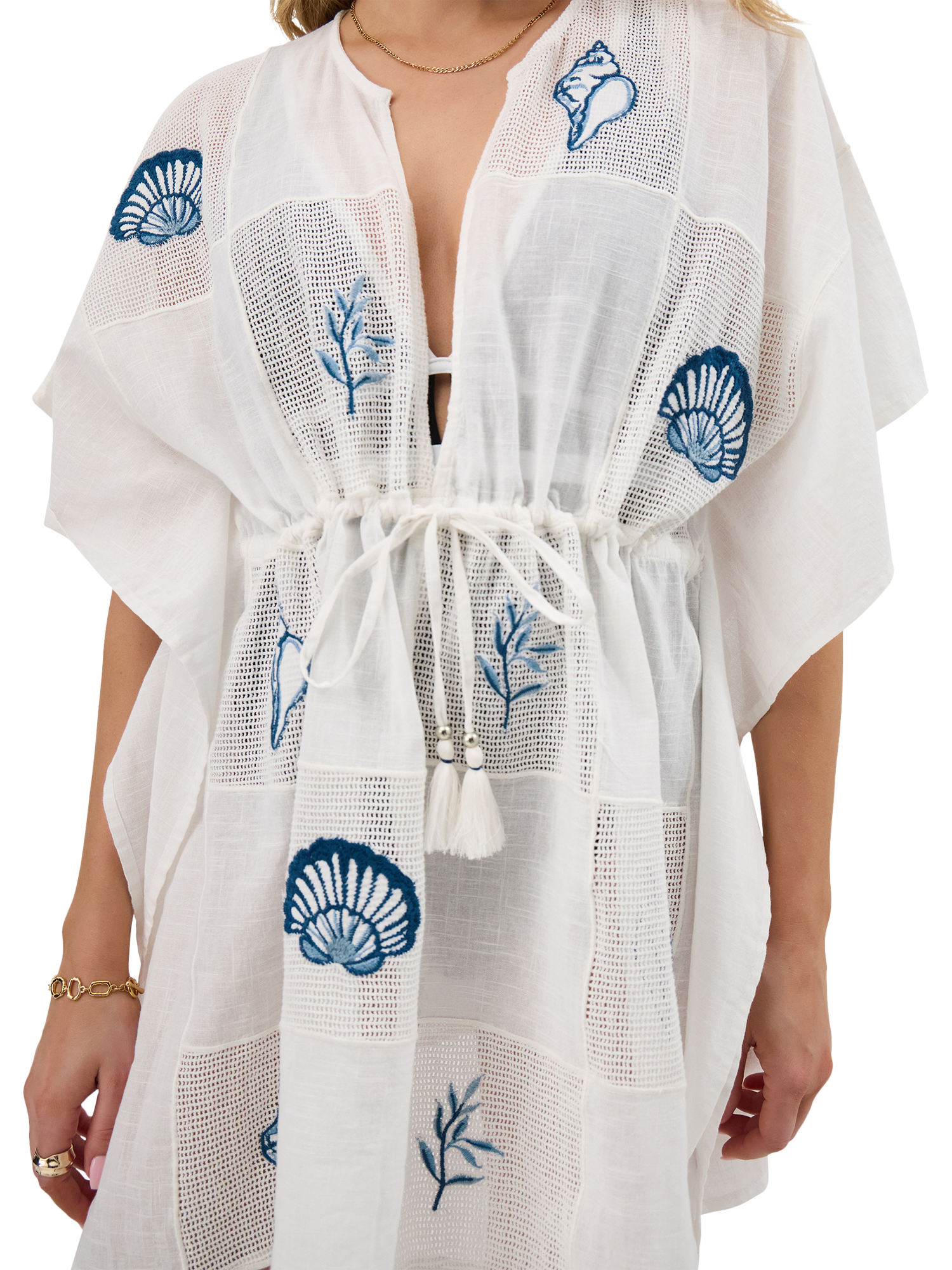 Designed in cotton, this kaftan is embroidered with ocean blue seashells over the mesh patchwork squares. Finished with tassel cords at the waist - leave loose for a relaxed vibe or tie up for a cinched look.