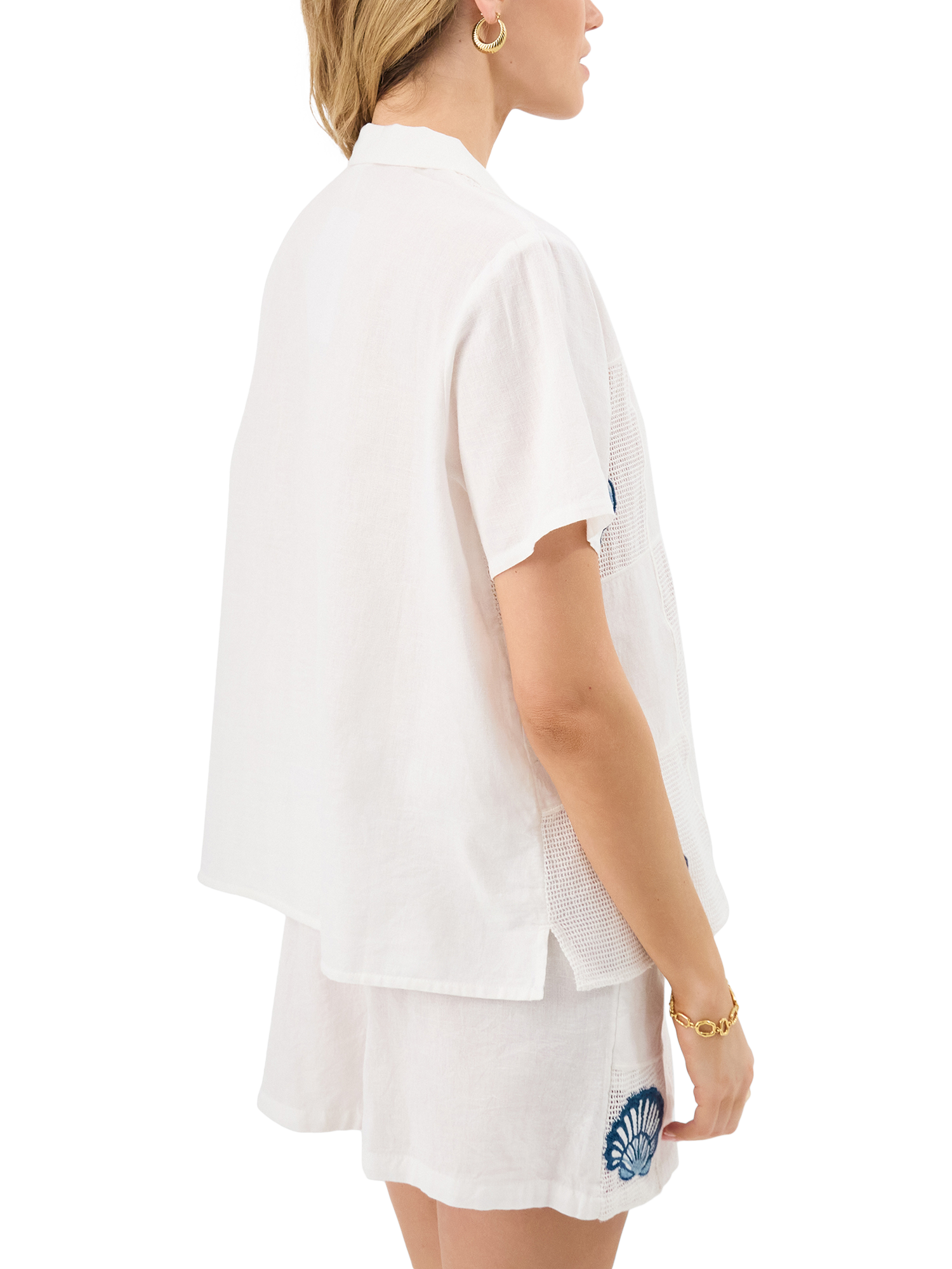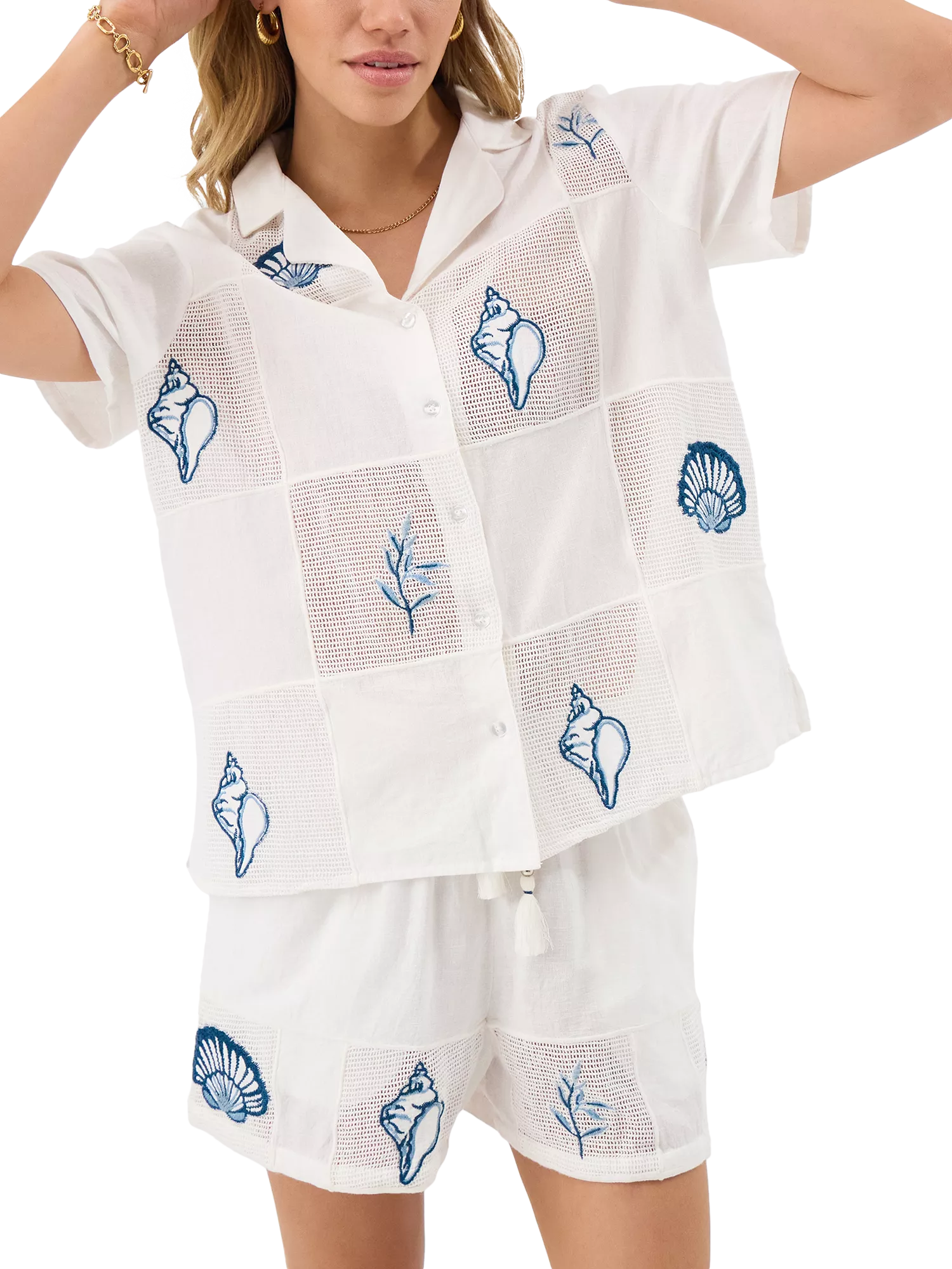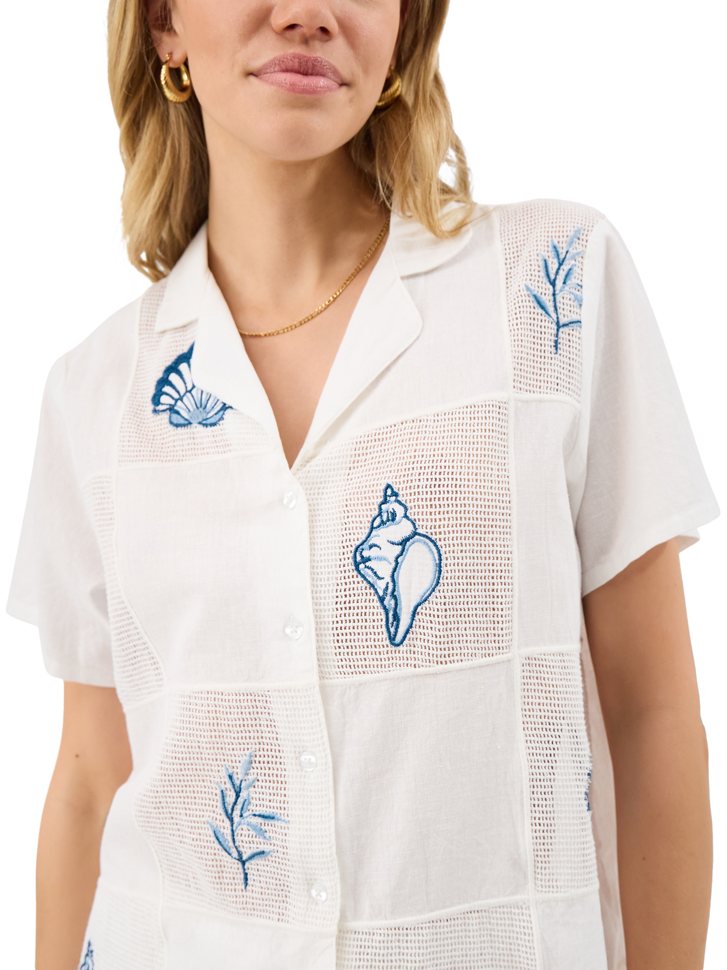Designed in cotton with mesh patchwork squares, this shirt features short sleeves and embroidered seashells in dreamy ocean colours.