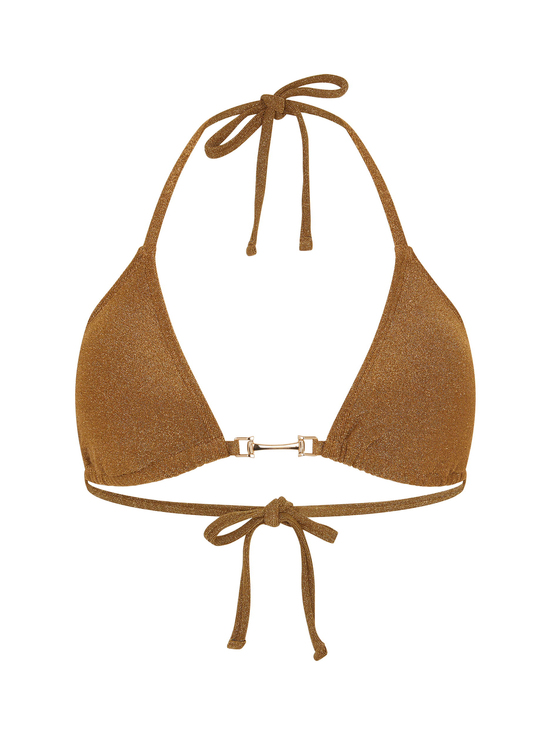Adorned with a gilded finish, this bikini top features tie fastenings that secure round the neck and back. Finished with hardware to the centre.