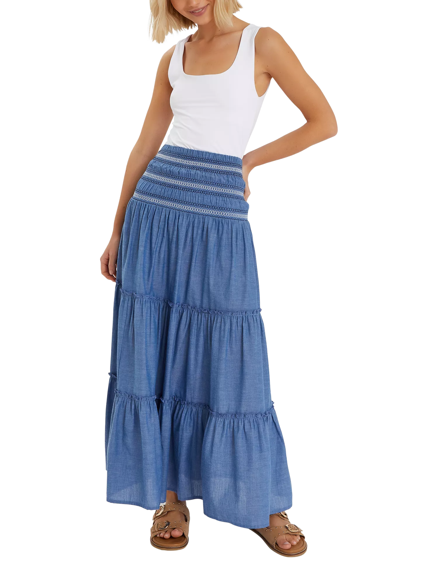 A summer must, this maxi skirt is designed from lightweight cotton in a denim blue colour. It's designed with a stretchy smocked waistband and tiers that swish and sway above the ankles.