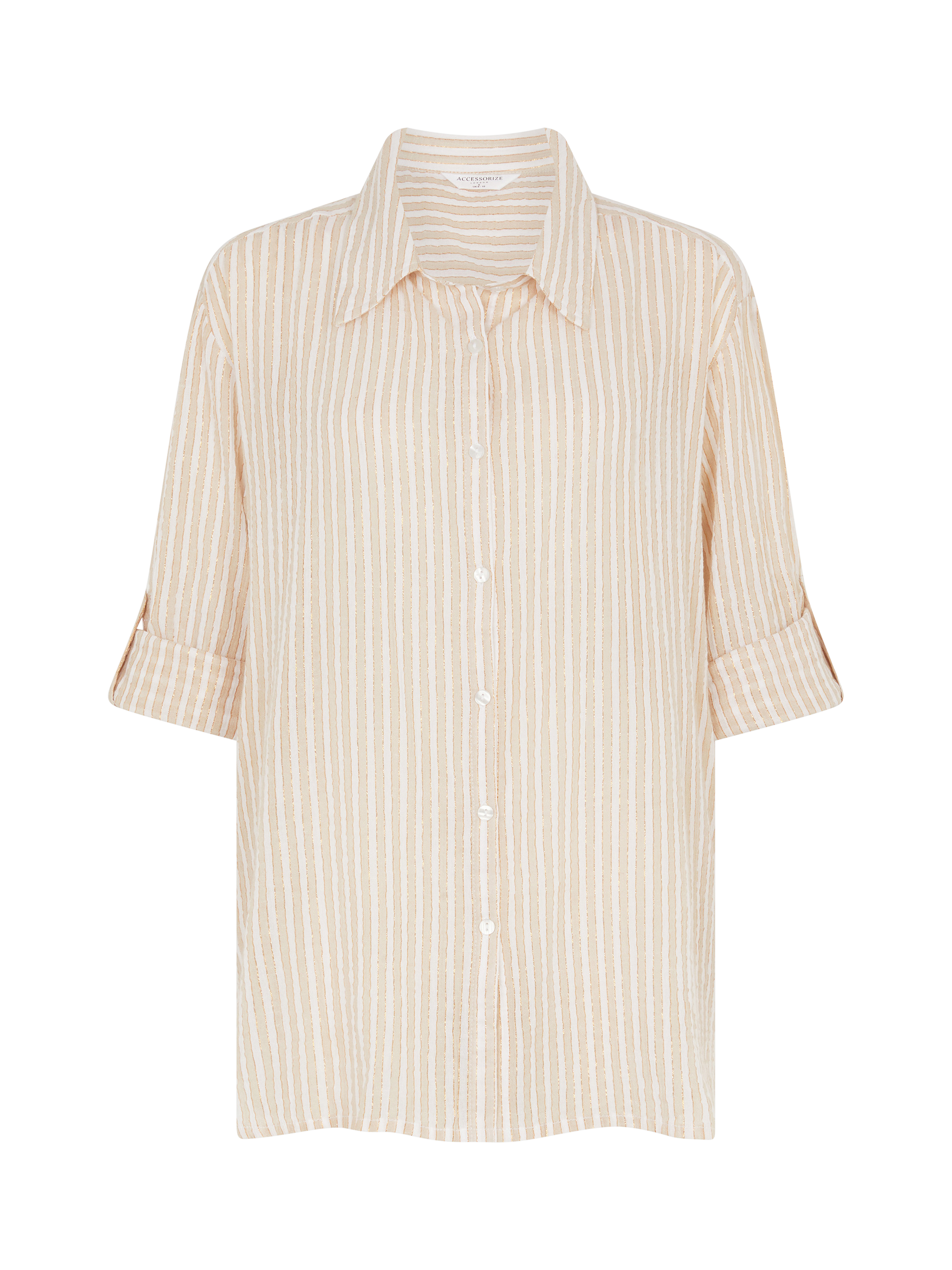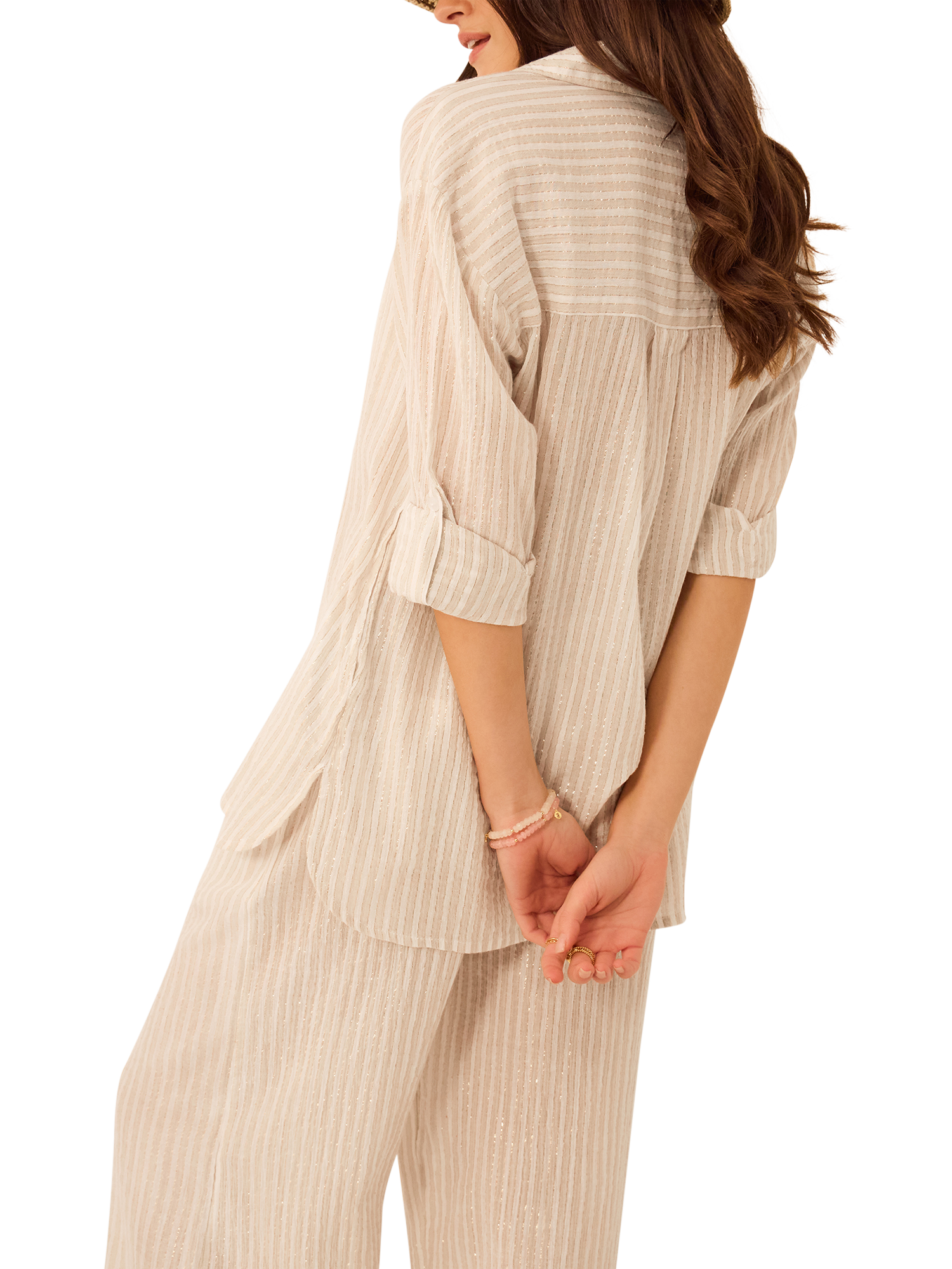 Upgrade your regular cover up with this sparkly shirt. Designed with neutral stripes and glittery threads, it's the perfect way to elevate your beach look, whether you're grabbing a drink at the tiki bar or lounging by the pool.