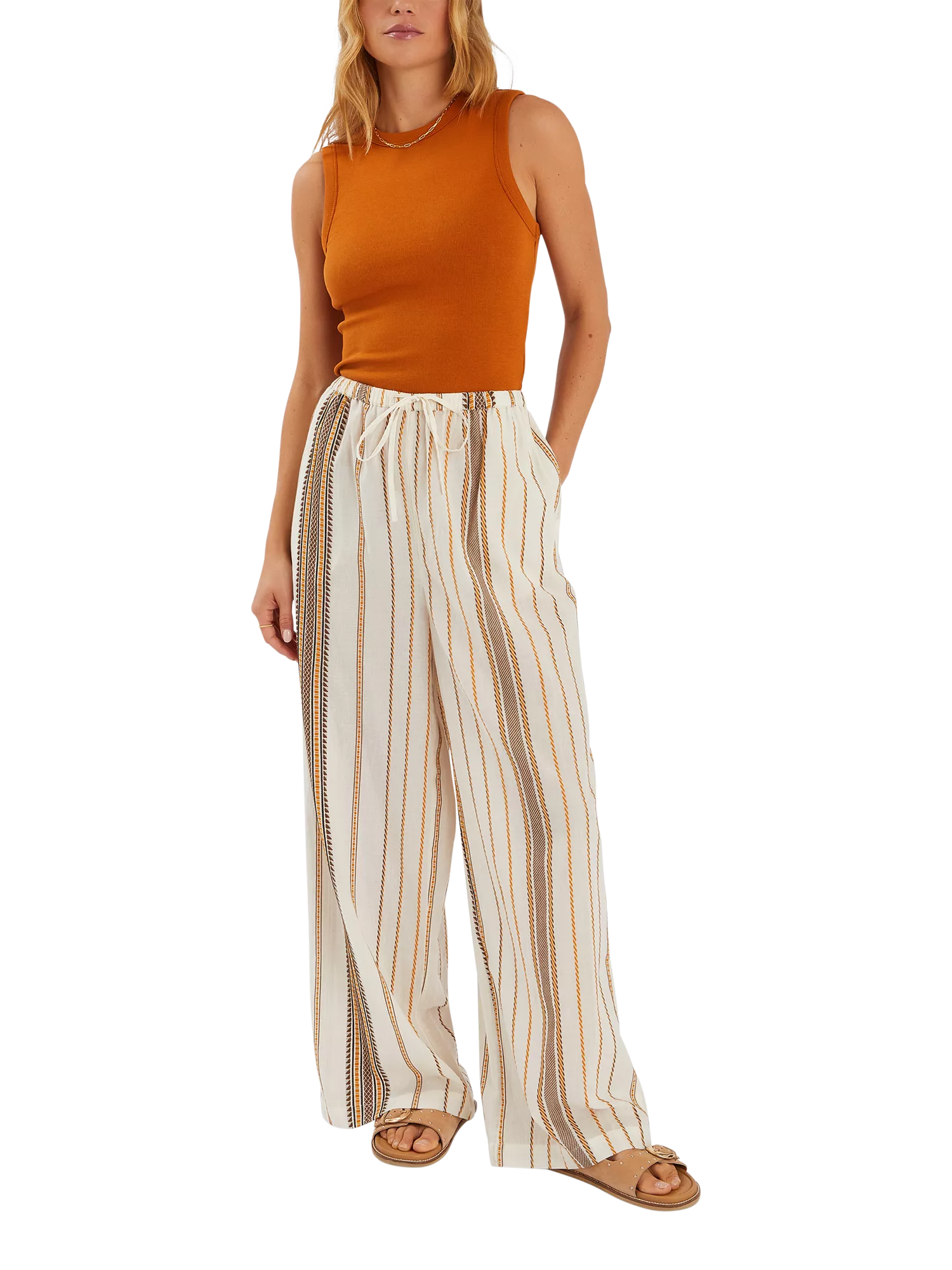 Designed in soft, breezy cotton, these trousers are patterned with decorative stripes from the comfy drawstring waist to the wide leg cuffs.
