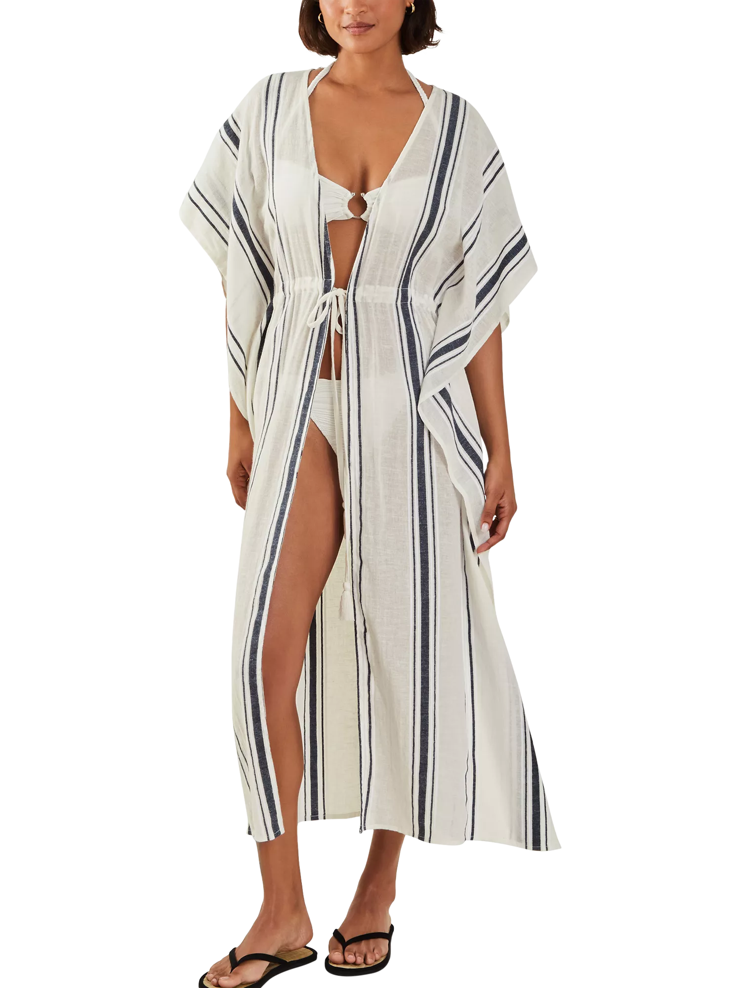 Manifest somewhere tropical. The perfect beach cover-up to slip on and head to the beach bar, this kaftan features a v-neck, floaty short sleeves and a maxi-length hem. Finished with a stripe backdrop.