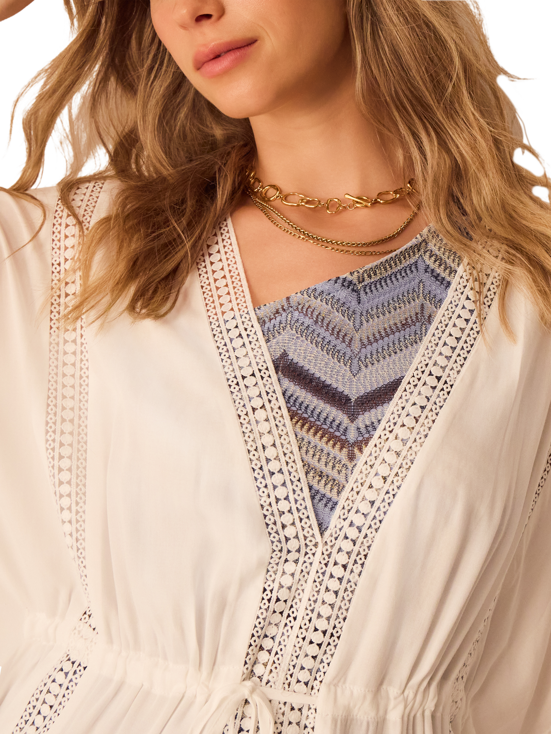 Crafted in a lightweight fabric, this kaftan features capped sleeves, a gathered waist, and tassel trims to finish.