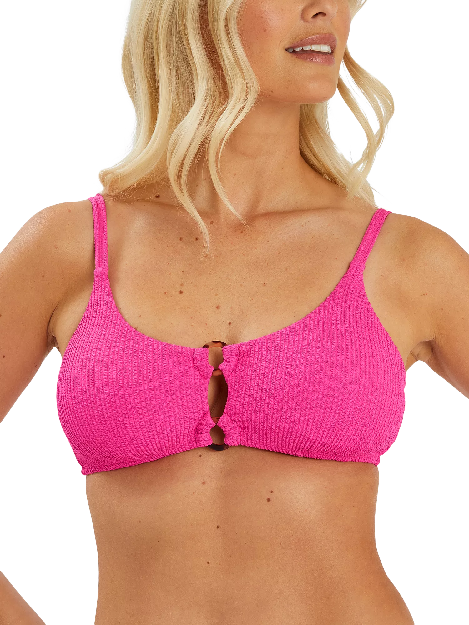 Designed in a bralette shape, this textured bikini top has double ring front details and adjustable straps.