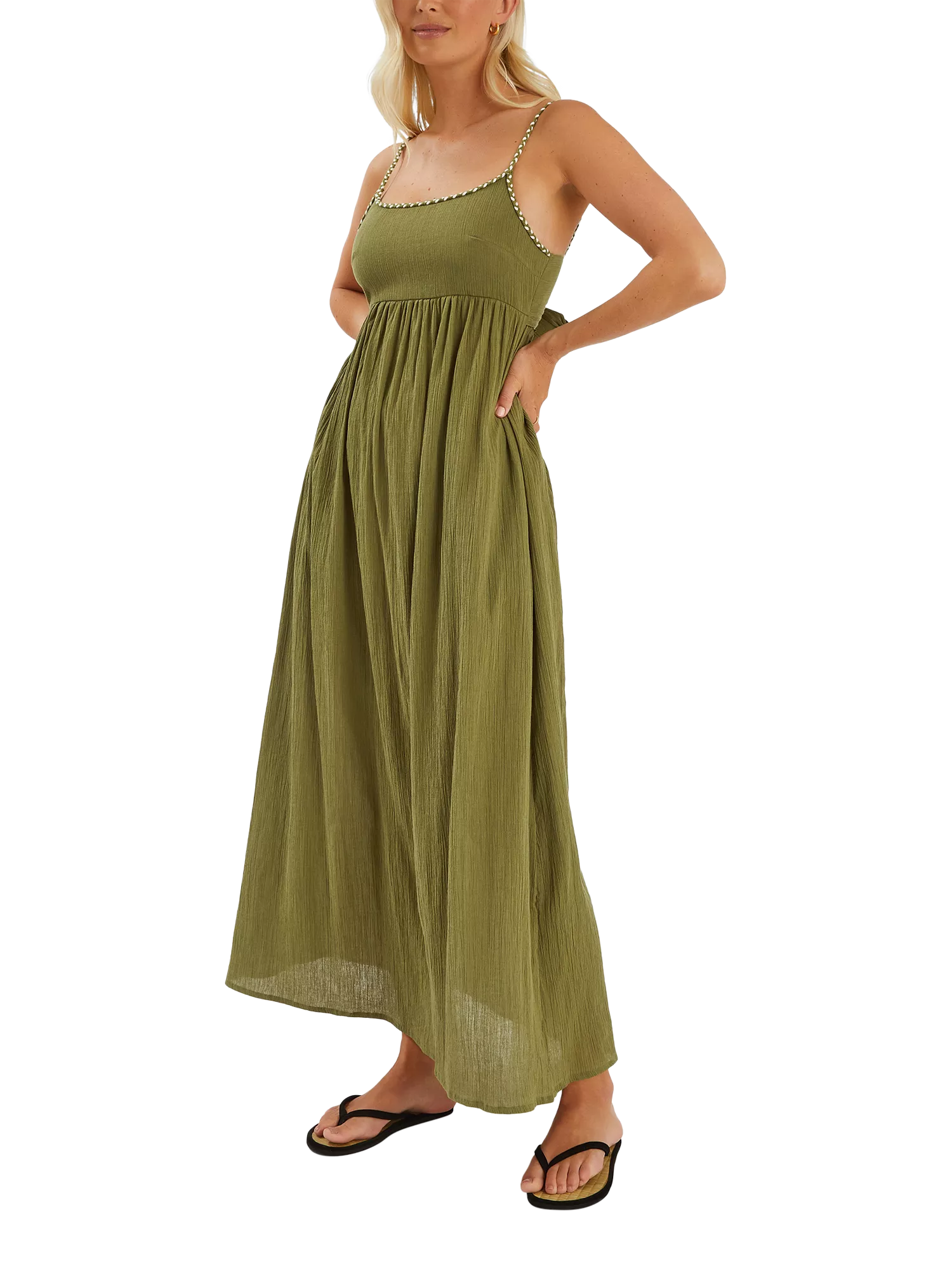 Designed in light, breathable cotton, this sleeveless maxi dress comes in a timeless khaki tone. Finished with a statement tie-back detail.