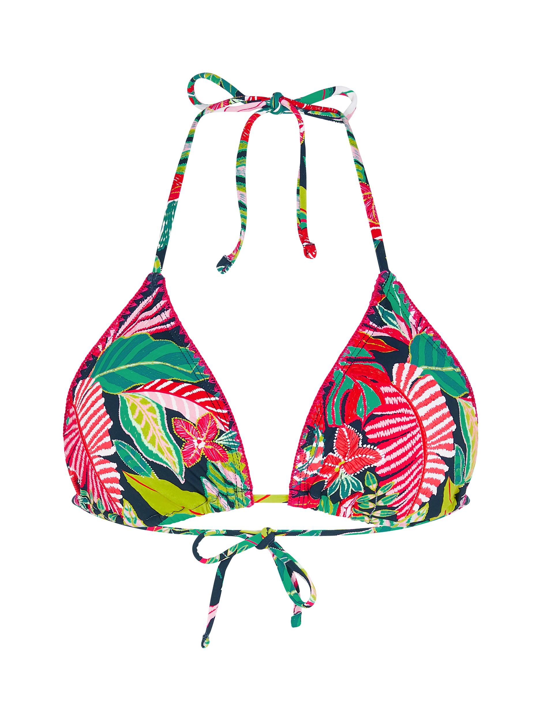 As suitable for spa days as it is for swimming in the Mediterranean Sea, this bikini showcases an all-over tropical print. It features a triangle cut with adjustable ties that fasten around the neck and back. Matching bikini bottoms are available.