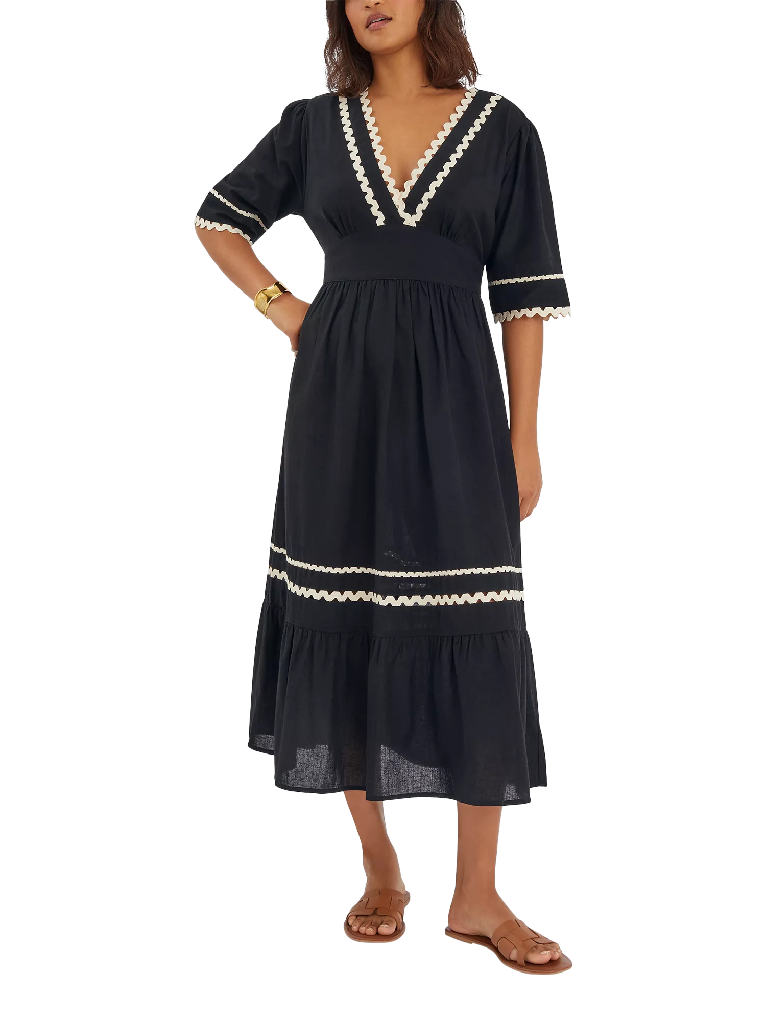 Whisked from a breezy cotton and linen blend. Designed with a v-neck, elbow-length sleeves, a midi length hem and bold ric-rac trimmings.