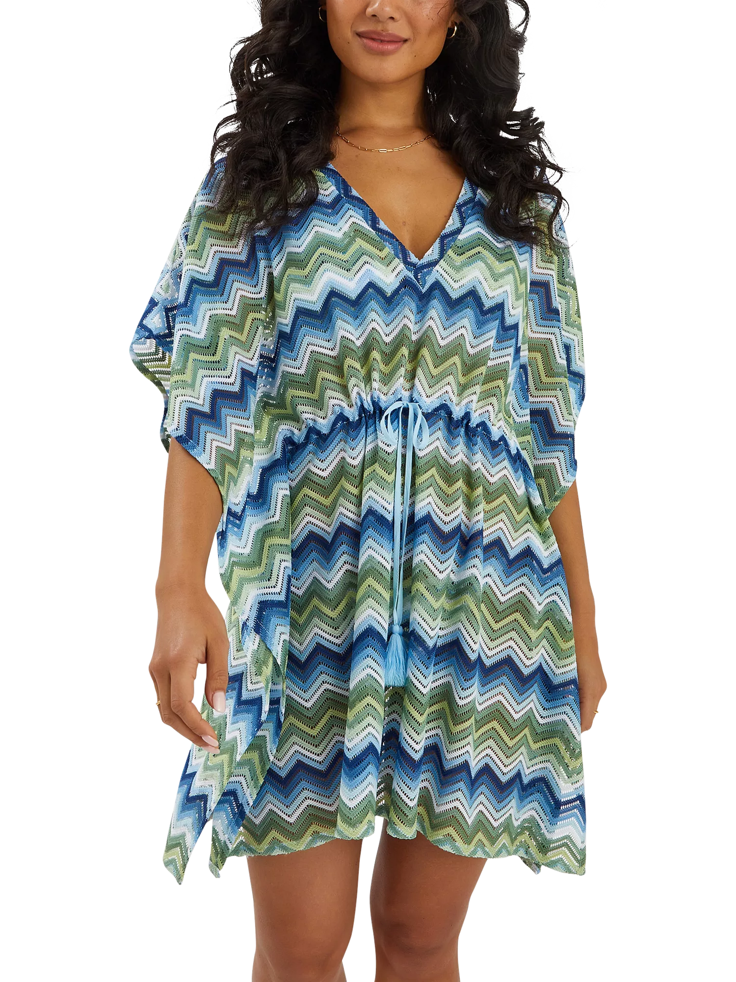 Adding a fun, retro vibe to your holiday looks, this kaftan is stitched with zig-zag stripes and falls to a mini length. The perfect pick to layer over swimwear when heading to the beach bar.