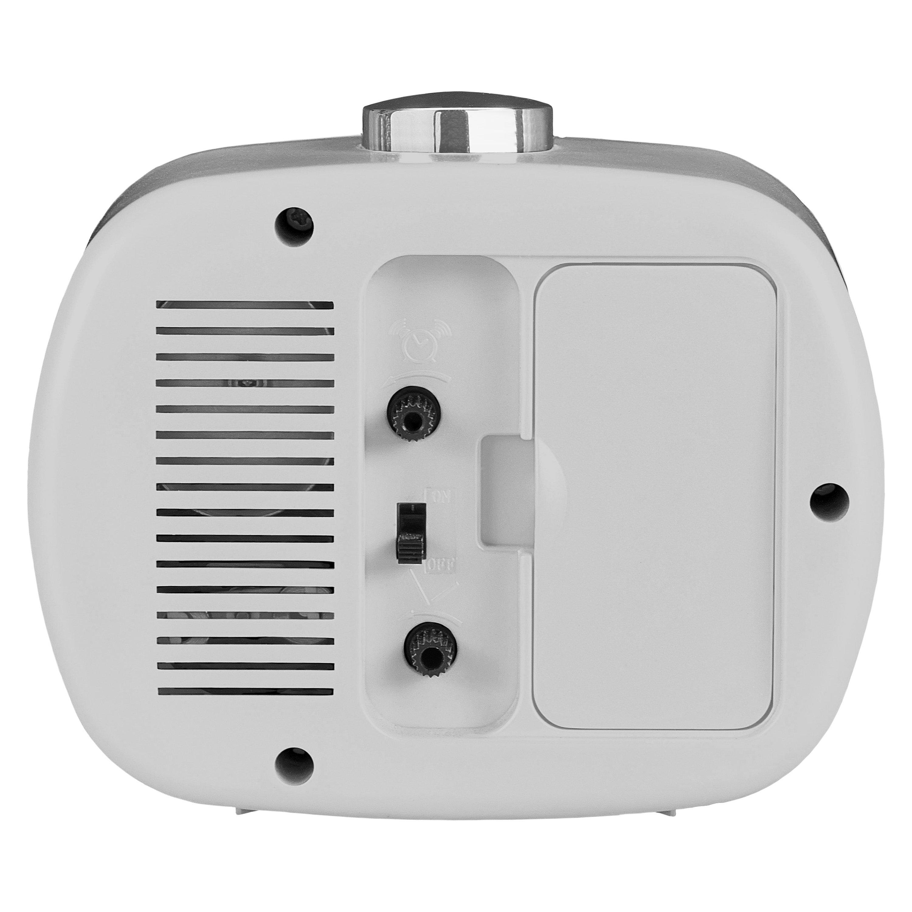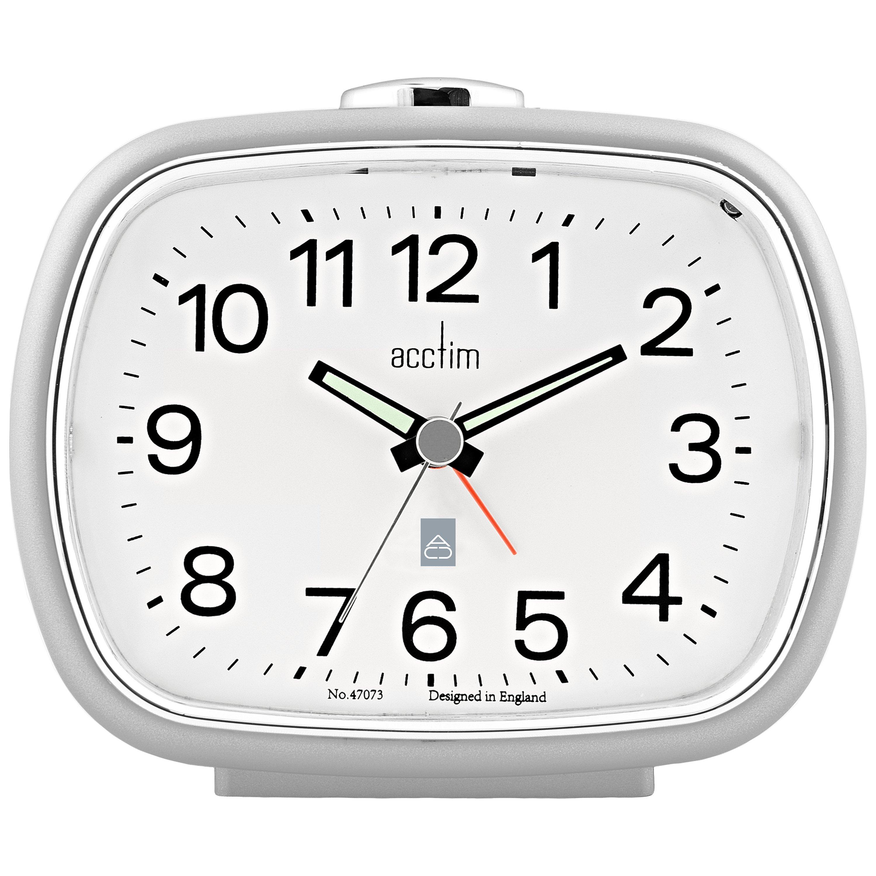 Designed with a touch of mid-century retro style, this alarm clock has easy-to-read Arabic numerals, luminous-tipped clock hands and a light function. Made with a plastic case and a chrome-effect plastic bezel and button, it has a beep alarm and a handy snooze function that will help you rise on time.