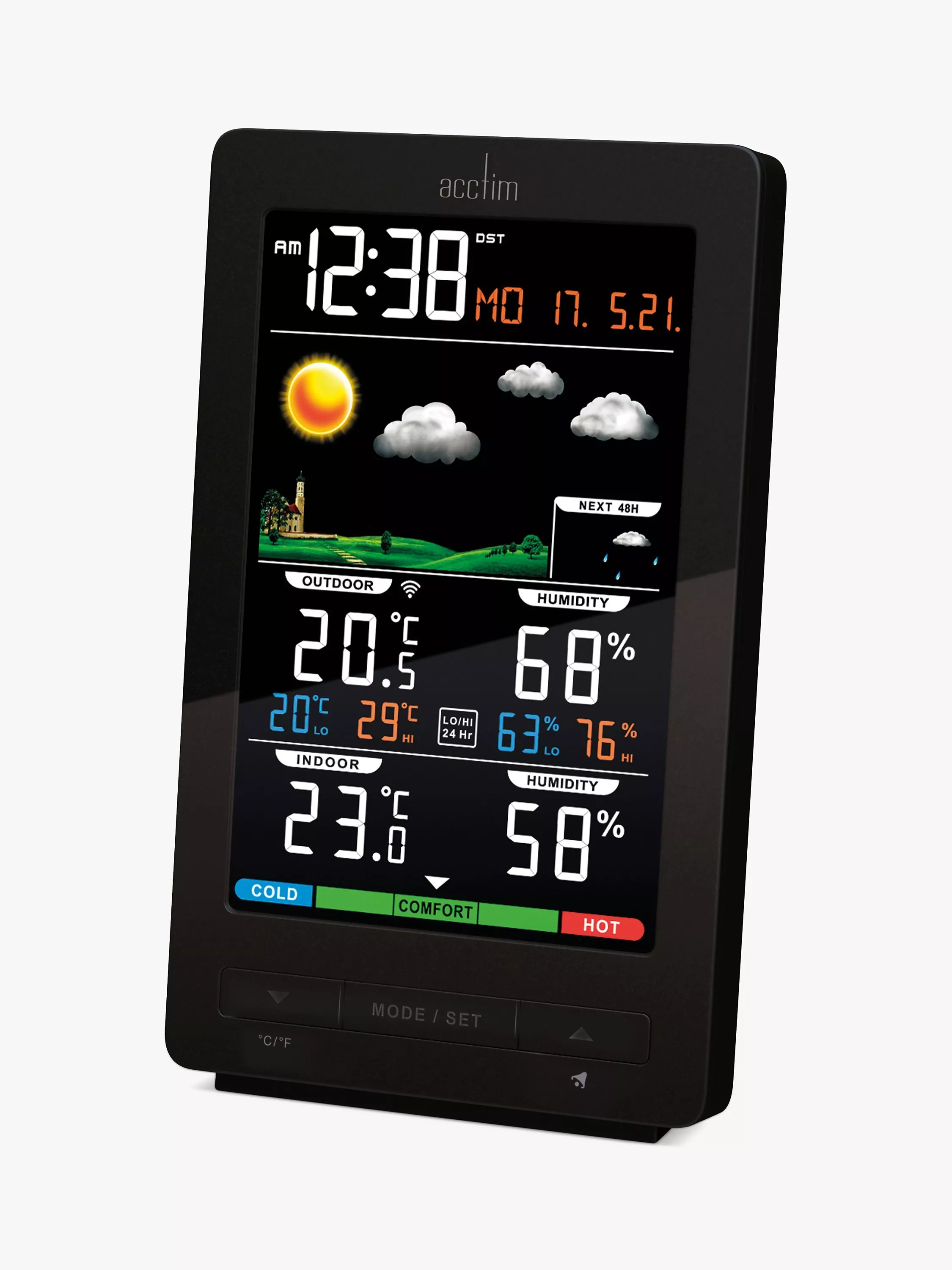 This barometric clock has a colourful LCD digital display with moving icons and adjustable brightness. It shows the time, day and date and high/low outdoor temperature readings with an alert function. It comes with a wireless weatherproof outdoor sensor and USB charging cable is supplied.