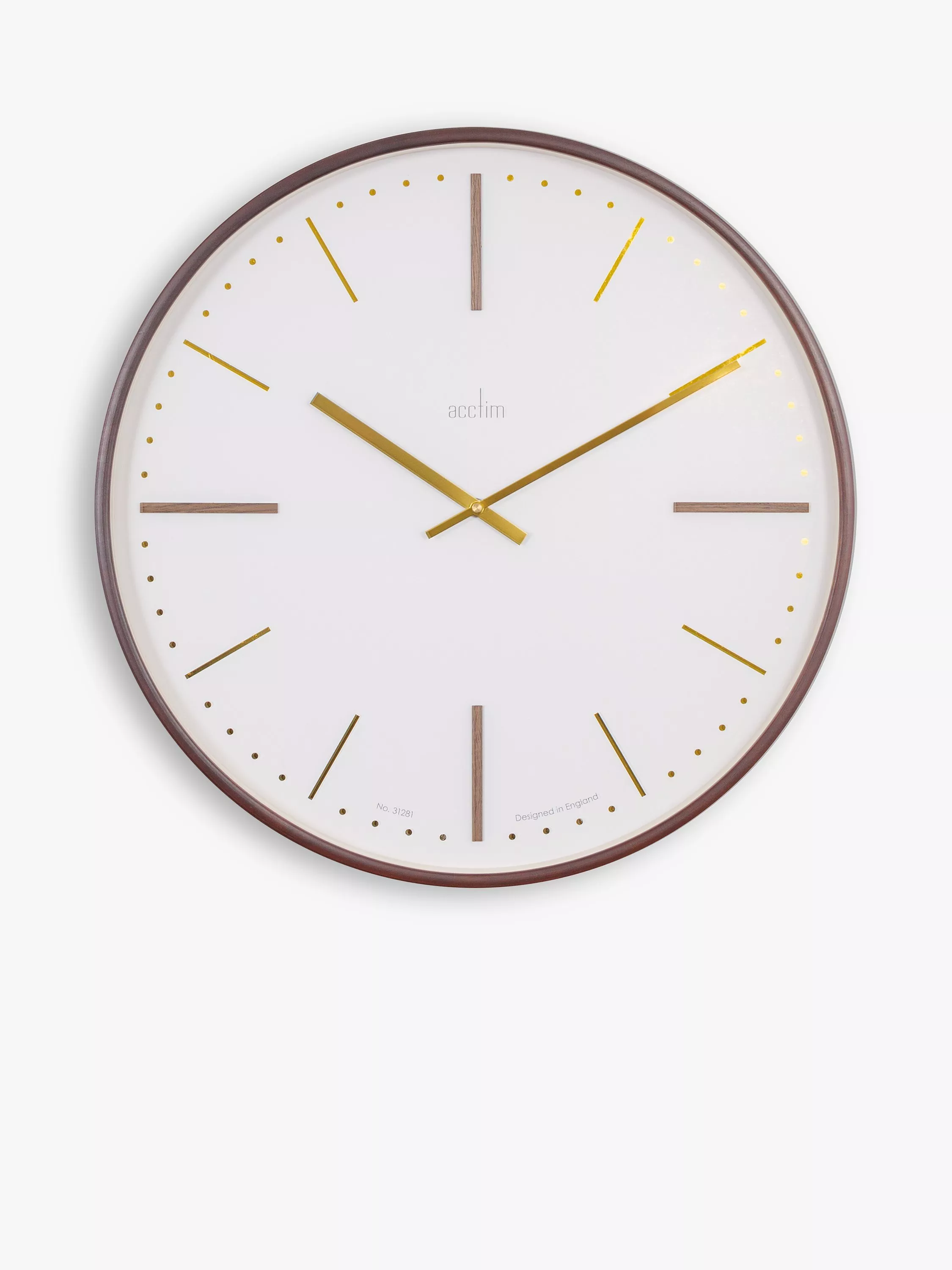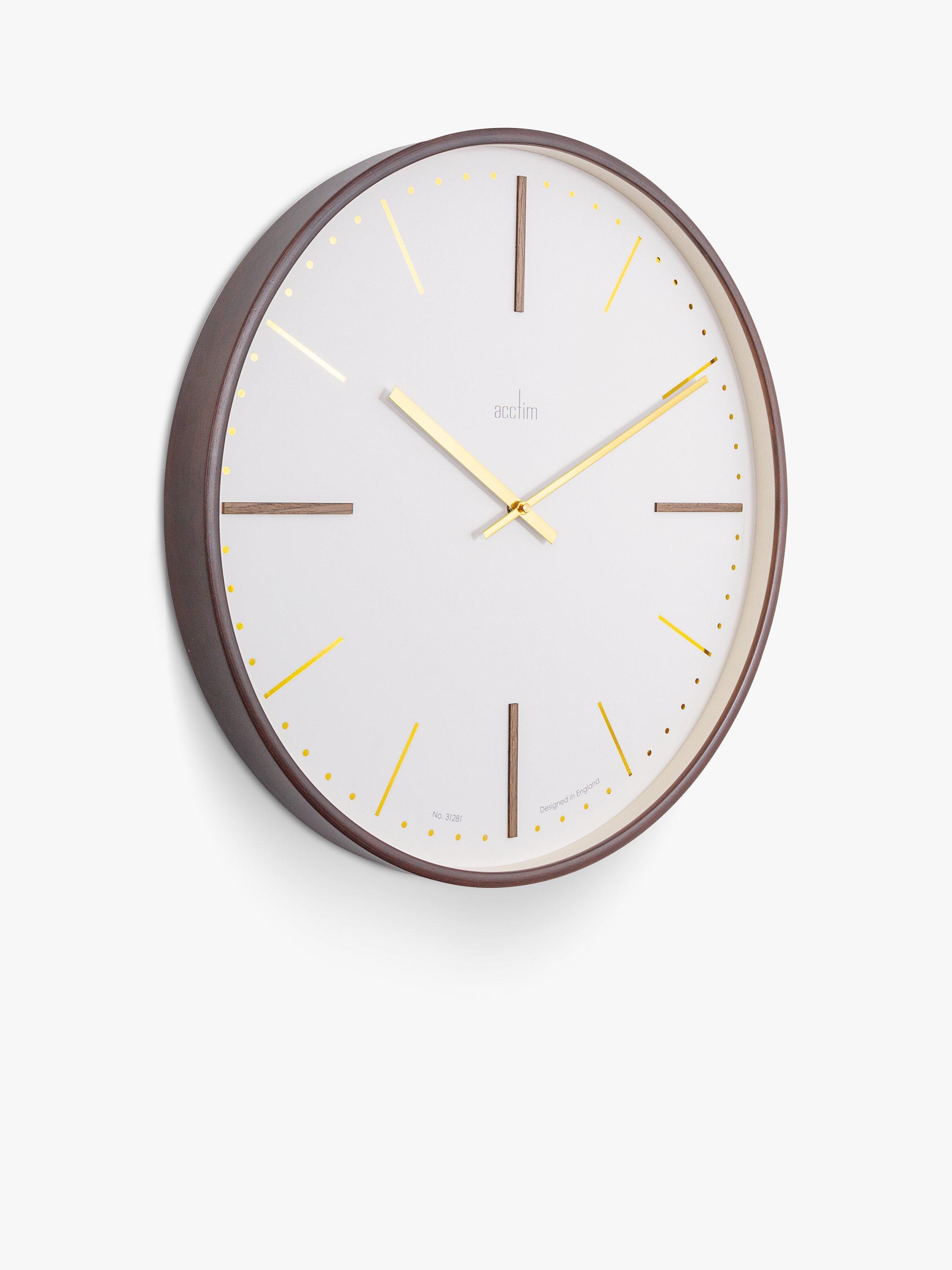 A clock that will take pride of place in any modern living environment, Knoll from Acctim celebrates mid-century modern design. A bent wood case wraps around a minimalist-designed dial, with raised wood batons and a gold foil minute track.
