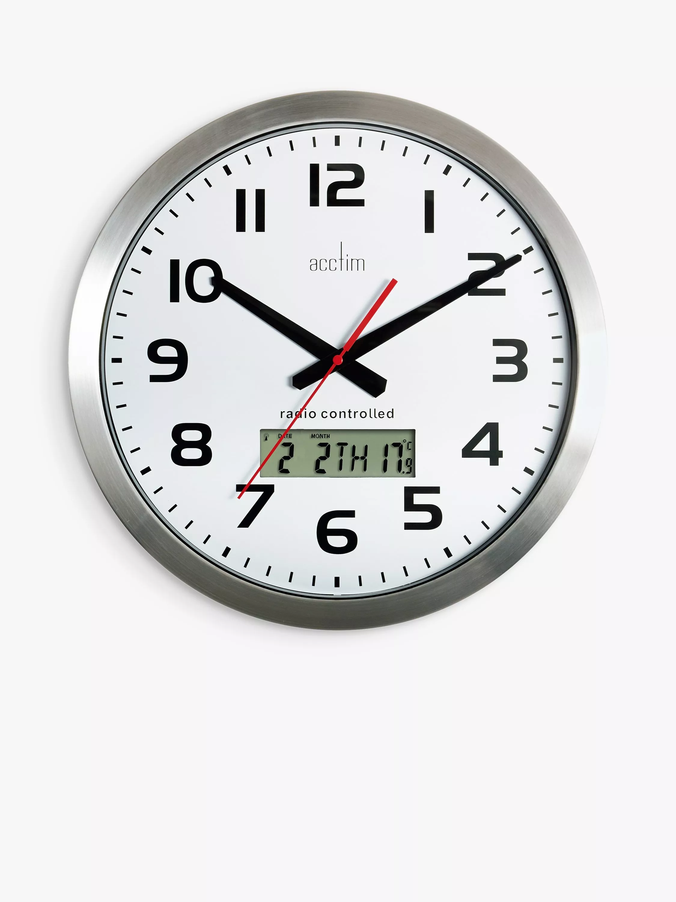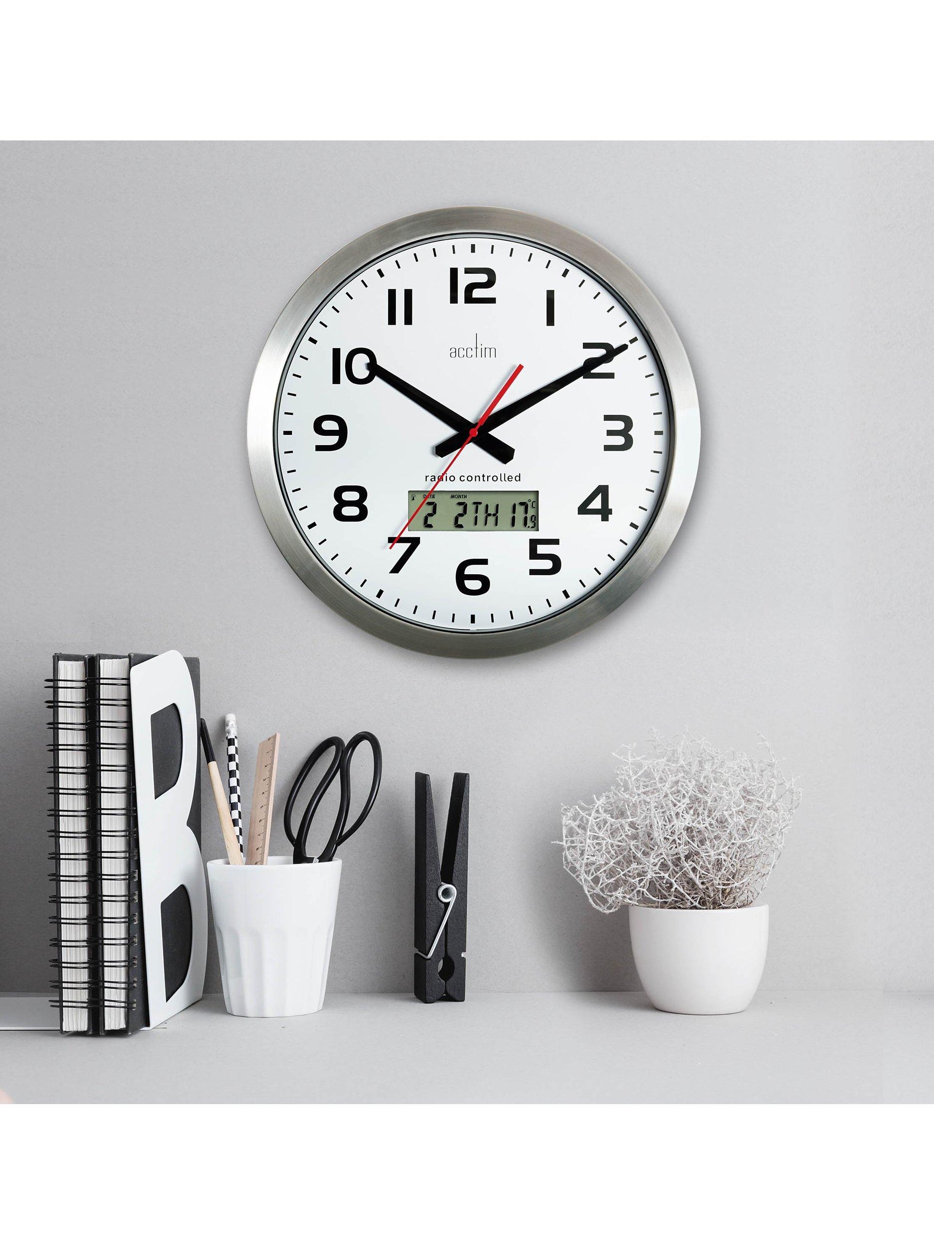 Combining modern technology with a retro-feel spun-metal casing and design, the Meridian wall clock from Acctim has an analogue dial with an LCD display showing the day, date and indoor temperature.