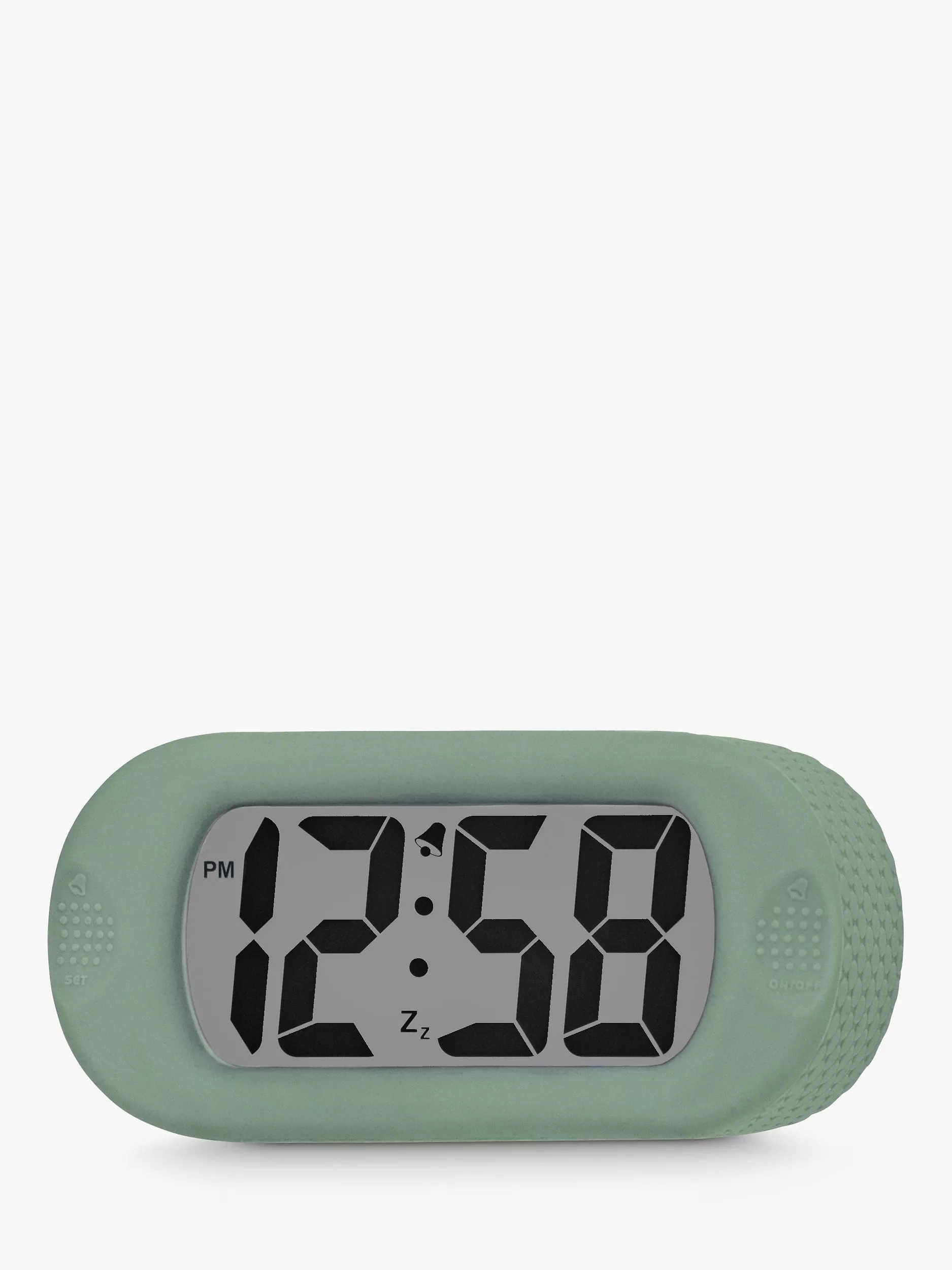 This jumbo alarm clock features a soft silicone case and a large digital display which lights up at the touch of a button. It's just as easily viewed at night thanks to Smartlite® technology. The bright, green backlight illuminates the display as the room gets darker and turns it off again during the daytime to prolong battery life.