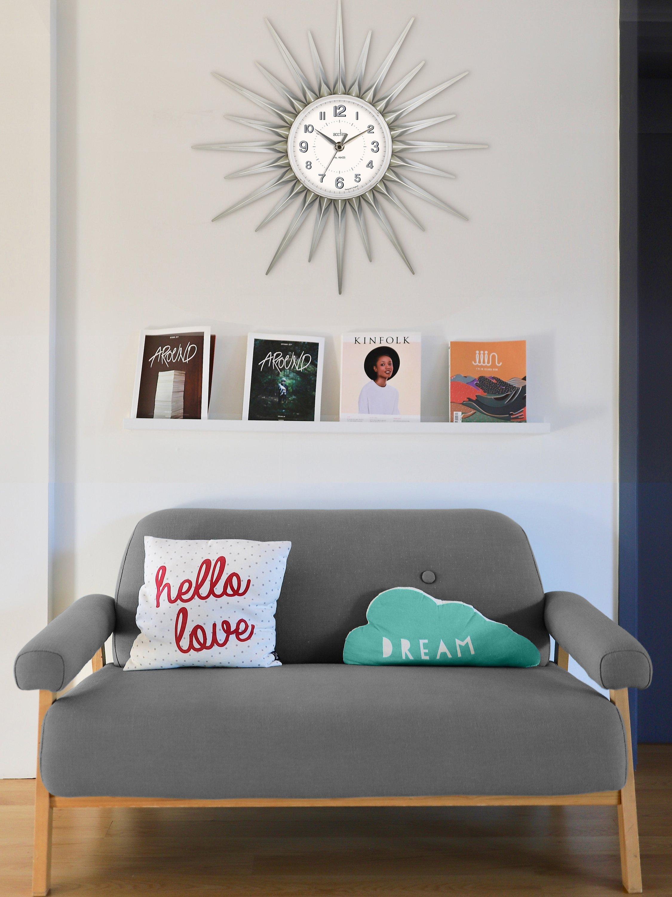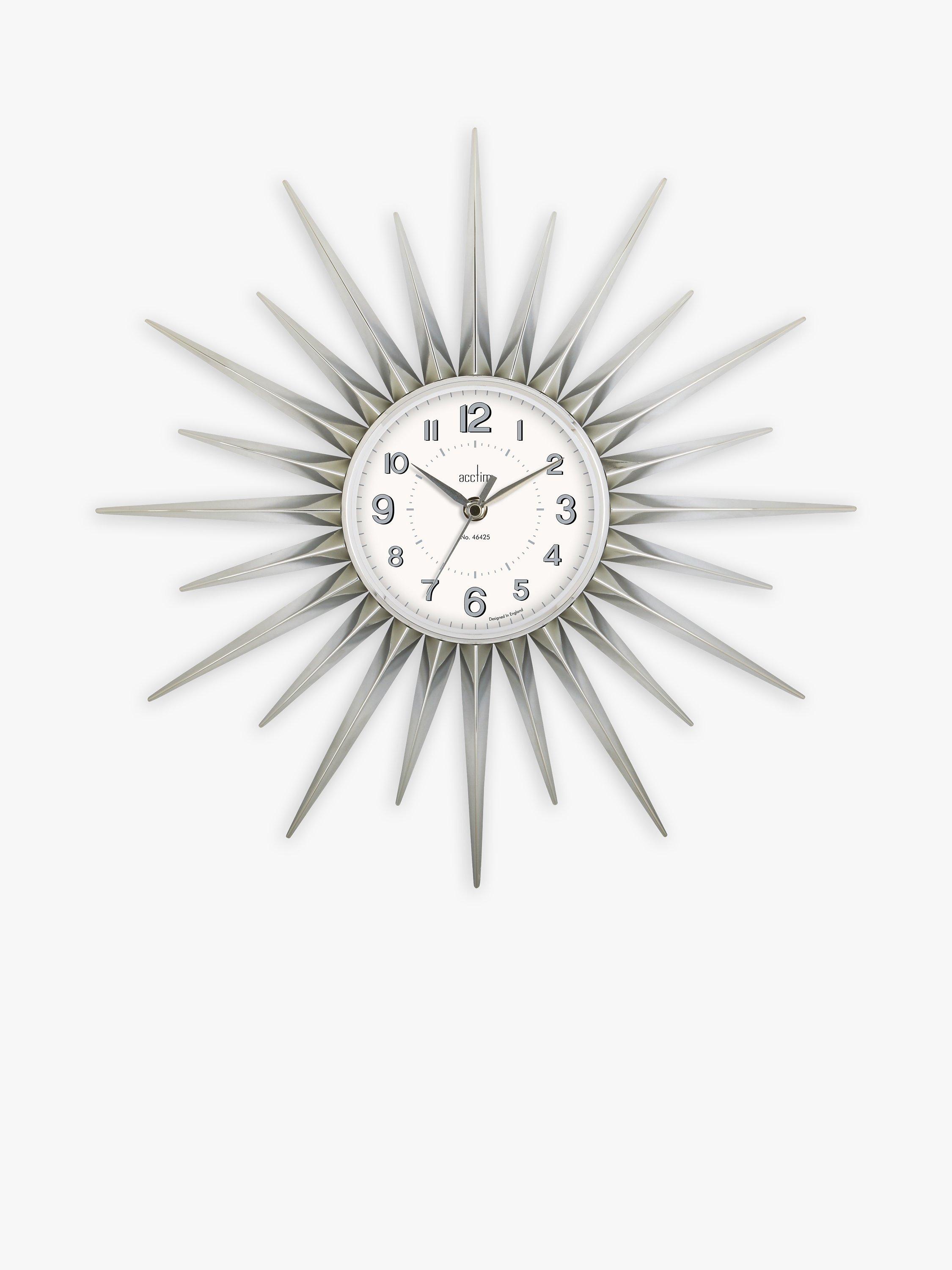 A retro sunburst-style design, the Stella wall clock from Acctim has wheel-like spokes and easy-to-read Arabic numerals behind domed glass.
