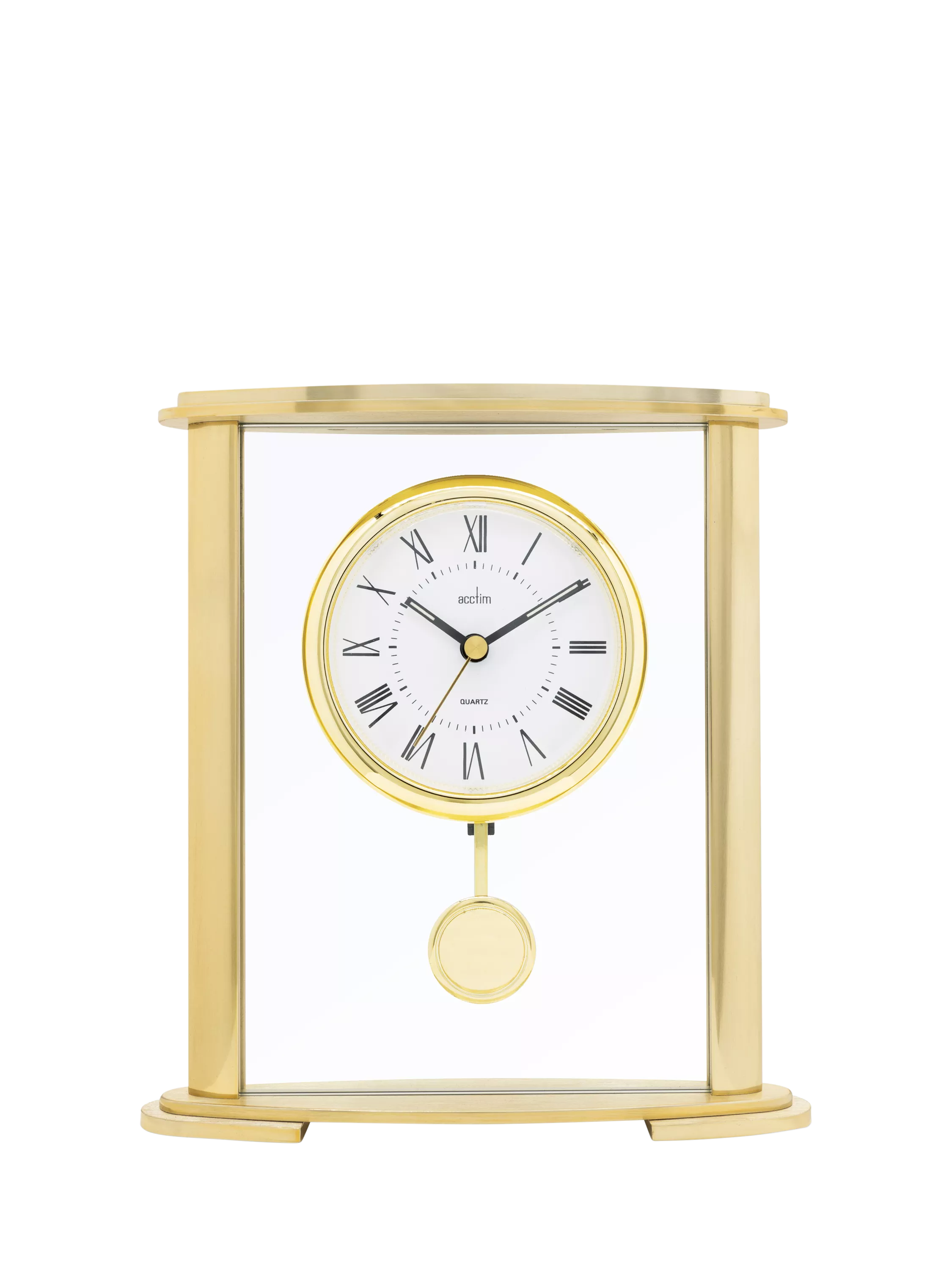 A modern twist on the traditional pendulum mantel clock, Welwyn from Acctim suspends the dial within a glass insert. Framed by a polished gold-toned bezel, the Roman numeral dial also has an inner minute track to balance the traditional with a more contemporary feel. The hands are luminous tipped for easier night-time viewing.